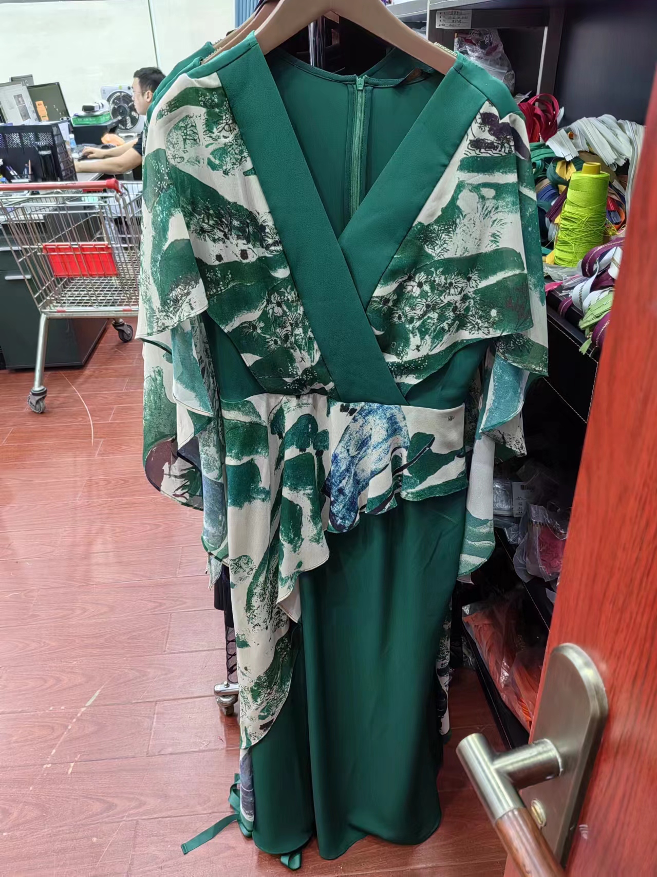HJ2S89_祖母绿色_连衣裙_春夏_气质优雅印花 V 领荷叶边收腰显瘦长裙_高级女装_BERNIEELEN 伯妮斯茵