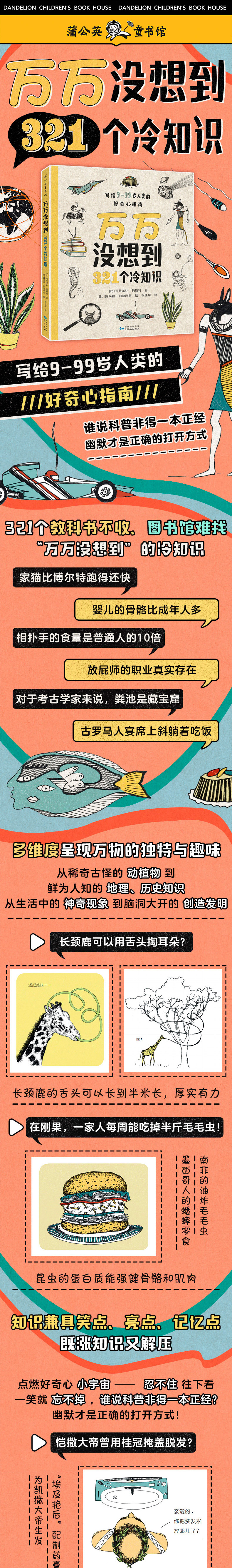 世界上只有人类才会因为获得冷知识而感到快乐。有时正是对小知识的关注和探索,才改变了我们的生活。 ★这是一本你每多读一页,就会变得更快乐一点的奇趣科普书。它收入321个教科书里不收、图书馆里难找、看到就忍不住大呼“万万没想到”的冷知识,让全球幽默知识爱好者为之疯狂。★从稀奇古怪的动植物到鲜为人知的地理、历史知识,从生活中的神奇现象到脑洞大开的创造发明,多维度呈现万物的独特与趣味。鲱鱼会通过放屁进行交流?长颈鹿可以用舌头掏耳朵?恺撒大帝曾用桂冠掩盖脱发?在刚果,一家人每周能吃掉半斤毛毛虫!一个人一生中被陨石砸中的概率约为1/700000……★用兼具笑点、亮点、记忆点的知识,点燃孩子好奇心小宇宙。让人打开就忍不住往下看,一笑就忘不掉,既涨知识又解压。谁说科普非得一本正经?幽默才是正确的打开方式!★300多幅插画大开脑洞,用夸张的风格让本书幽默系数再次升级。★原版风靡西欧,并俘获了多国读者的心。“321个冷知识”及后续系列在多个国家持续。