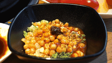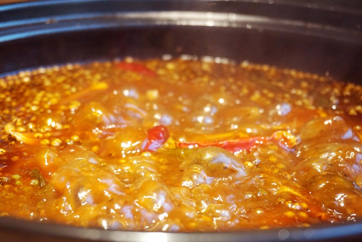 三角峰在上鱼虾馆的秘制红汤里煮过之后