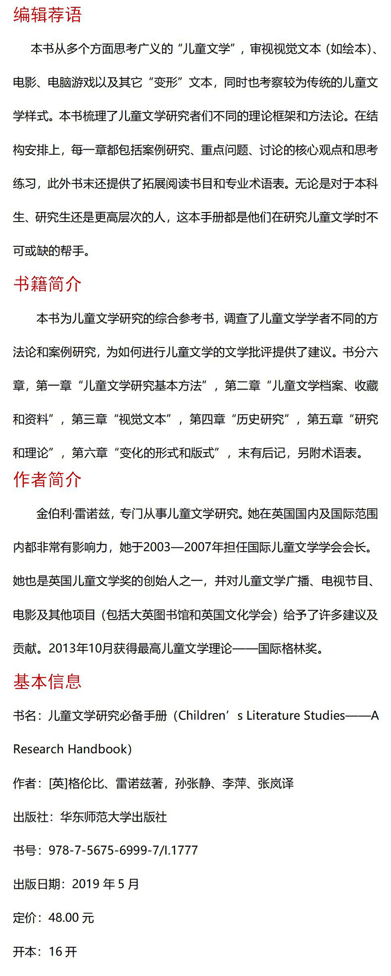 儿童文学研究必备手册 国际格林奖儿童文学理论书系 儿童文学研究的综合参考书