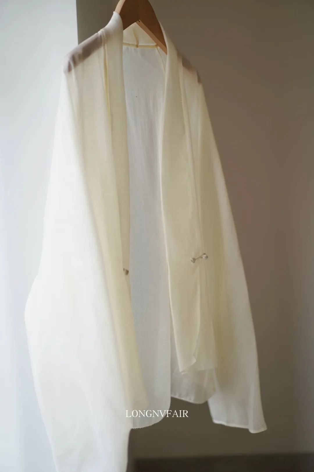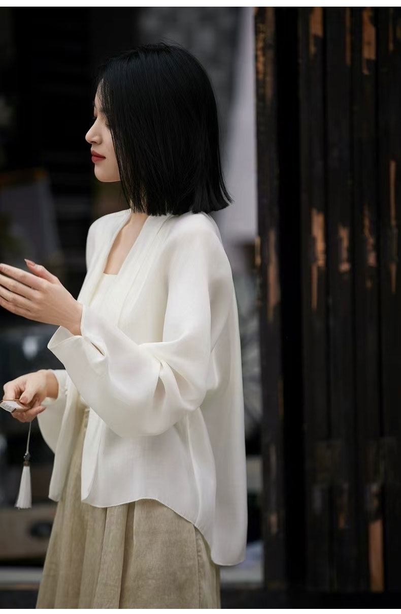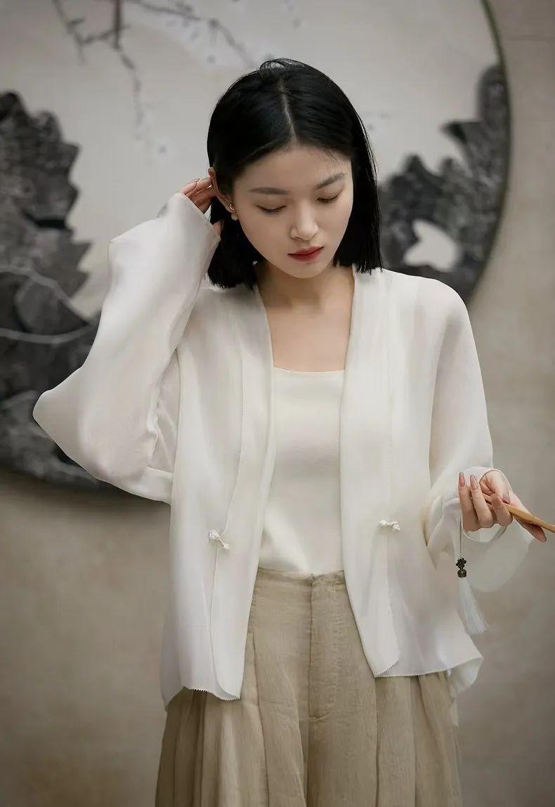 白玉映沙欧根纱外套,穿在身上飘逸,有光泽,就算静止也难挡自带的流动感~