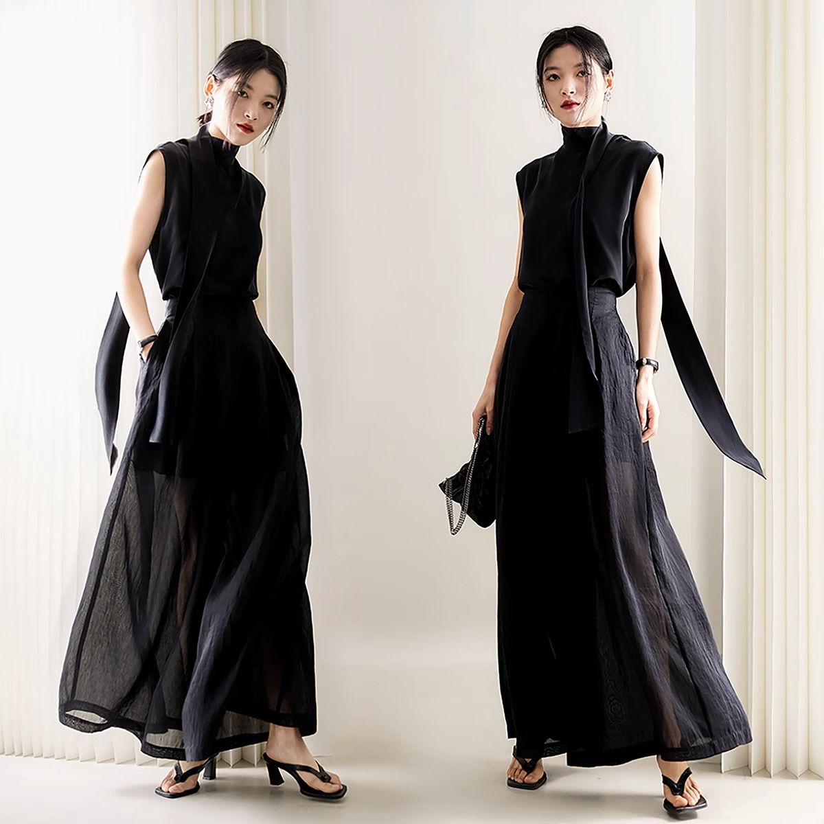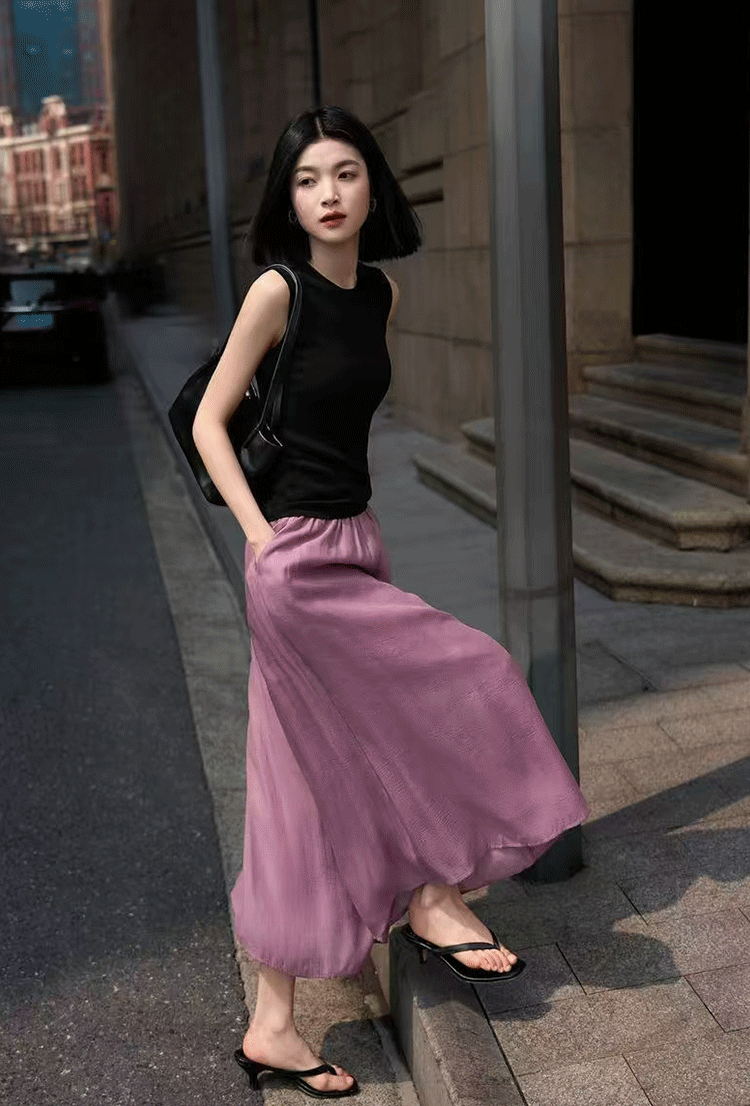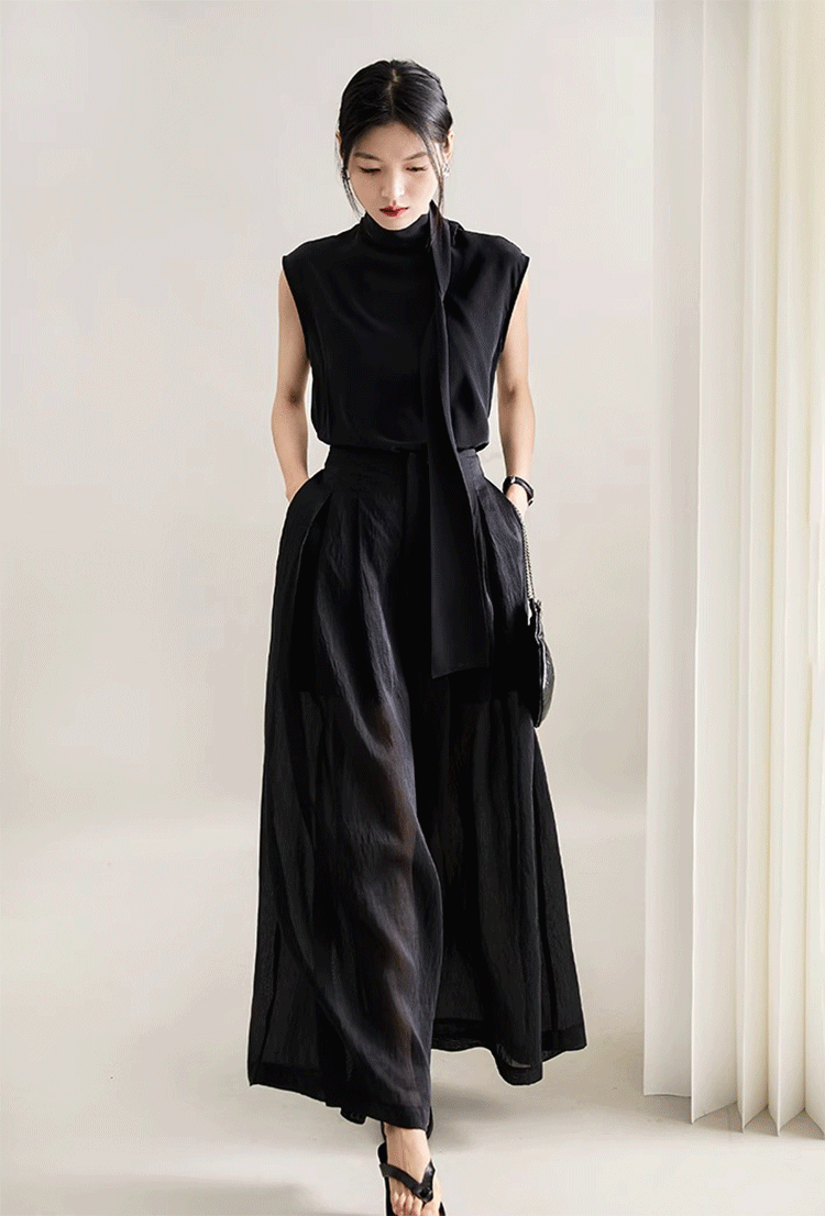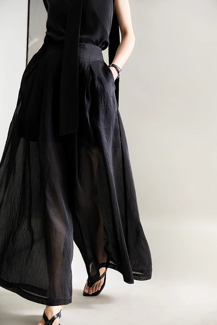 夏天,穿黑色真的太高级,带着亚麻肌理感的黑色裙裤,艺术气息满满。