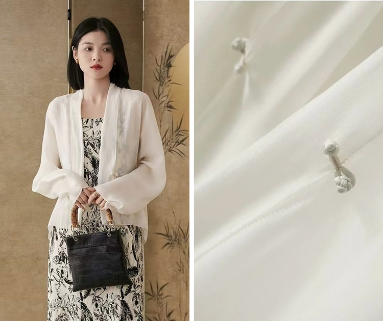 两侧的中式盘扣是点睛之笔,精致且造型感十足,将国风古韵与现代时尚完美融合。