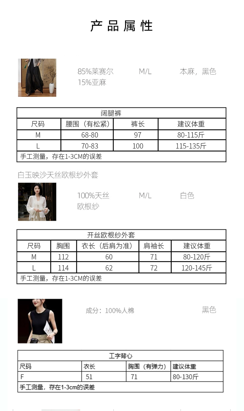 为了这条裙裤,我们买手姐姐还在同品牌找来两款搭配单品:黑色修身背心和白玉映沙欧根纱外套。