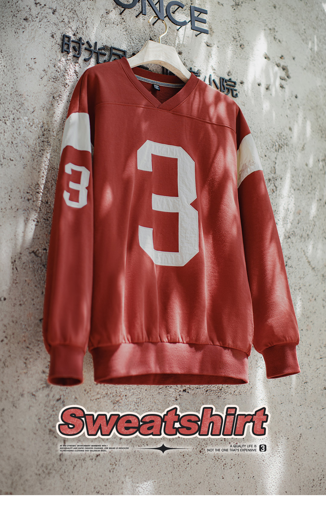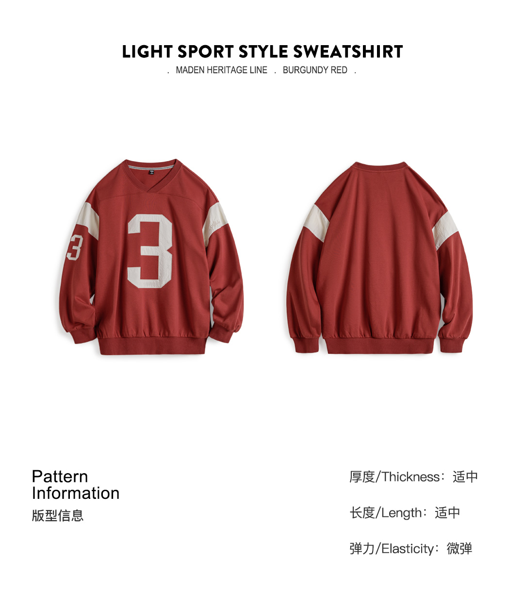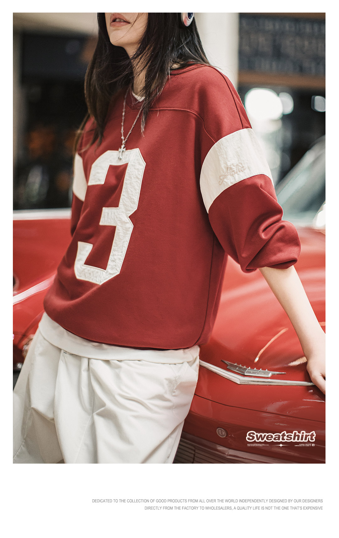 马登美式复古棒球V领无帽字母撞红色拼接套头长袖休闲卫衣女士秋