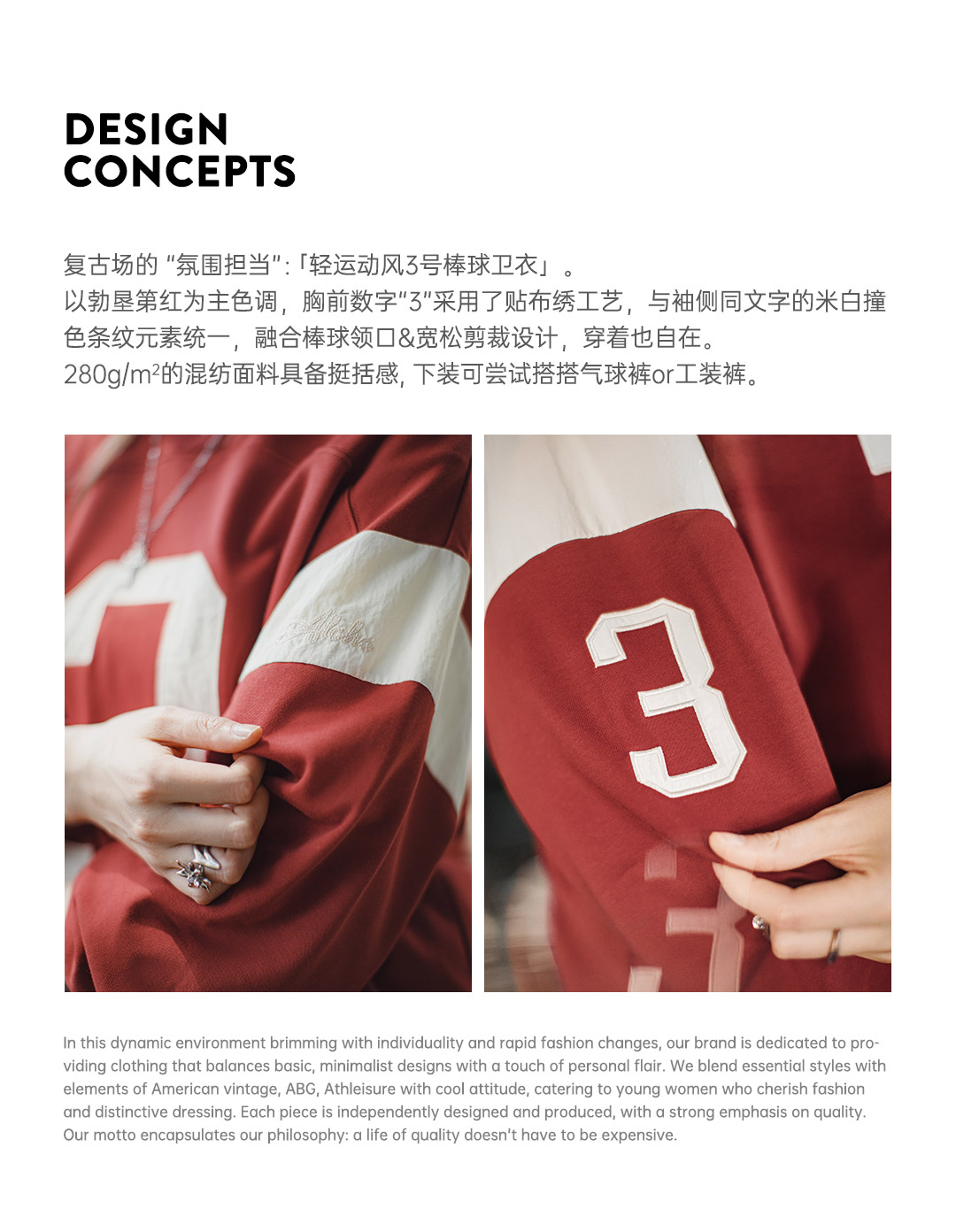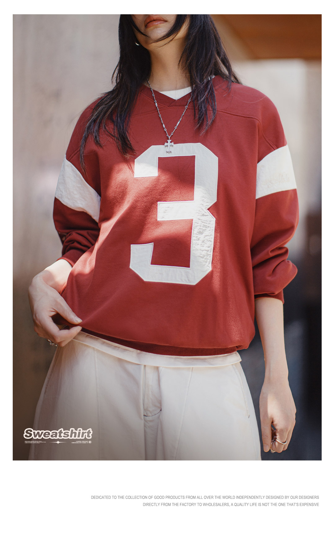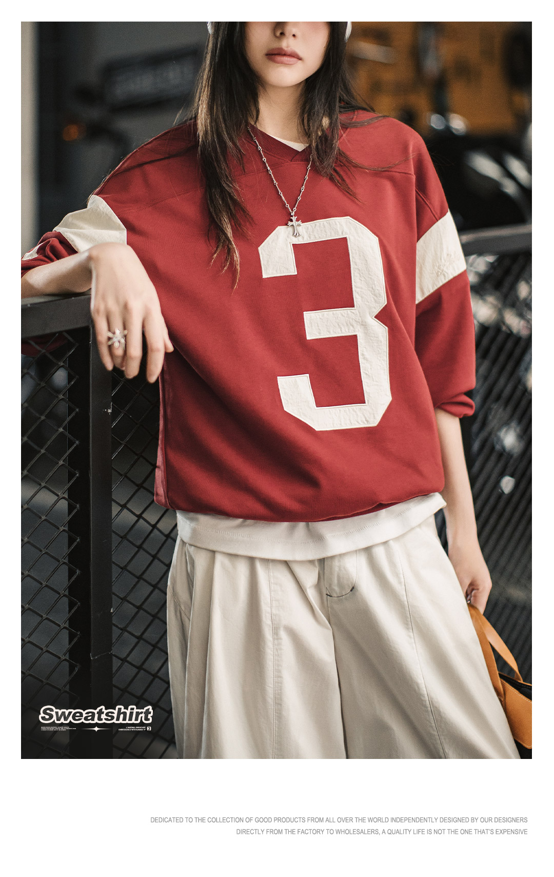 马登美式复古棒球V领无帽字母撞红色拼接套头长袖休闲卫衣女士秋