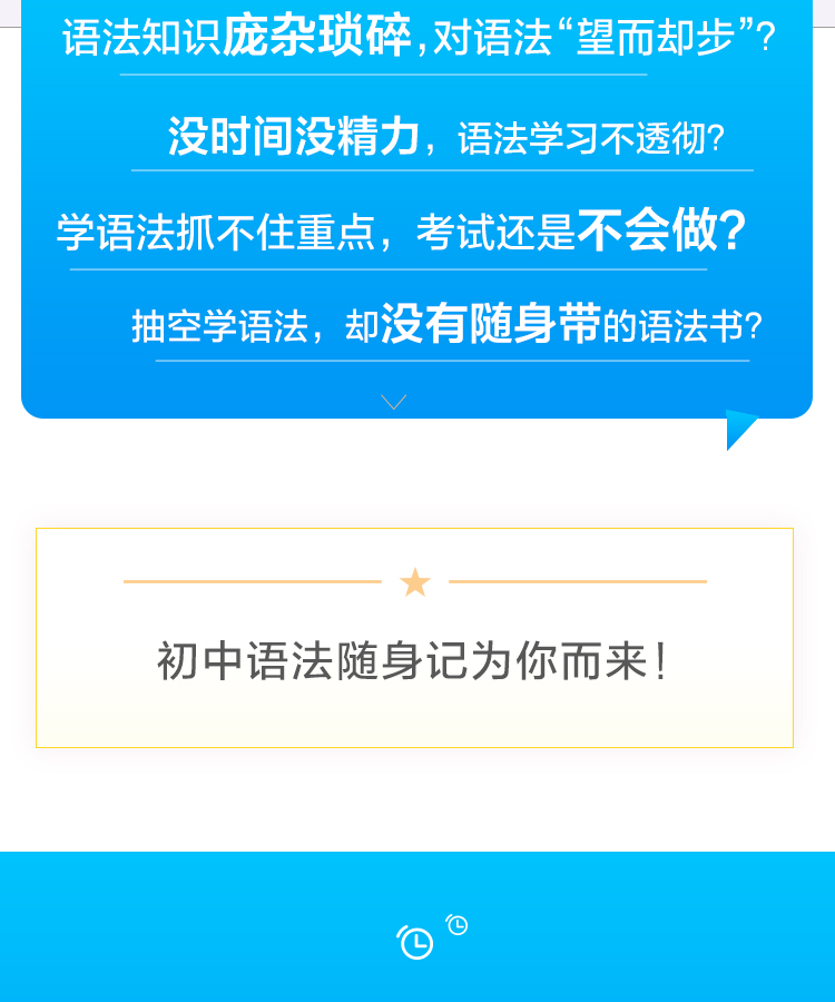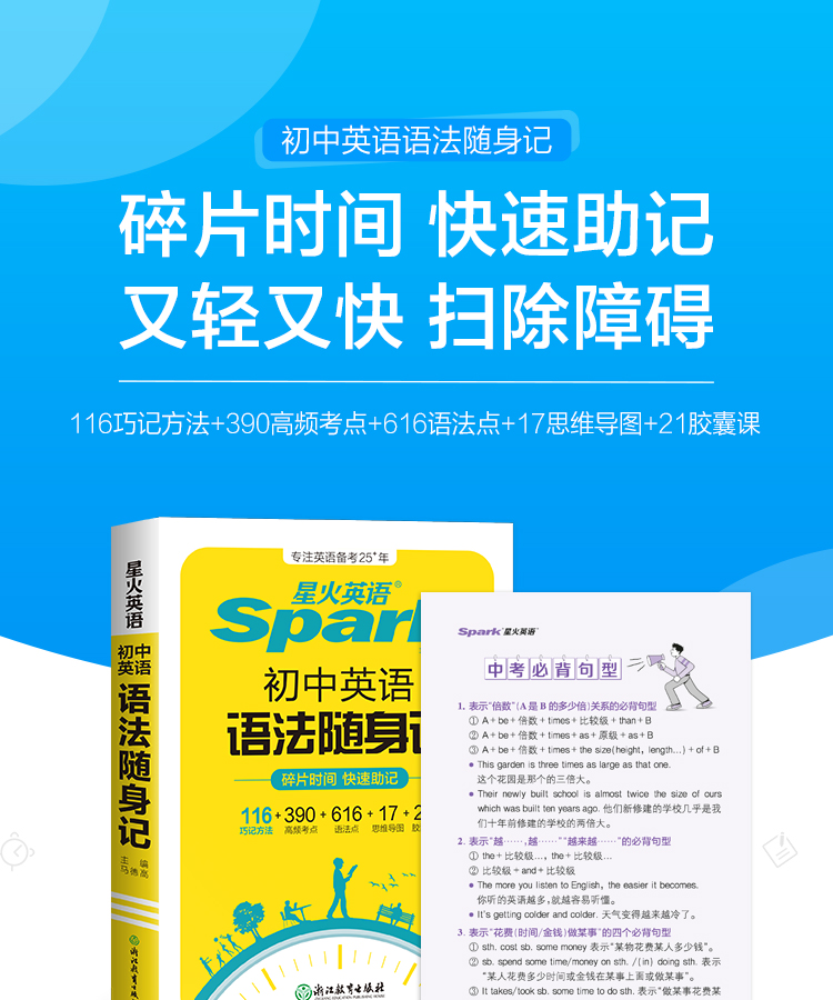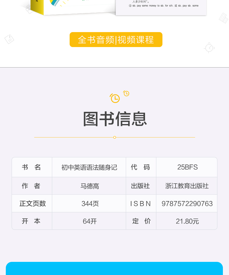 语法学习很重要,但也很;痛苦,到底该怎样科学有效地学习语法?经过多年深入研究和调研,编者为困于语法学习的初中学子找到了;良方妙药,即《初中英语语法随身记》!本书有以下几个特点:1.合理的计划,语法学习变简单本书将繁杂的语法知识合理地划分为十七章,语法学习在科学的计划中变得轻松、简单。2.精练的重点,学习目标更明确本书根据新版新版《义务教育英语课程标准》提炼出核心语法知识,帮助学生快速掌握重要的语法知识,直击中考考查要点。 3. 系统的编排,语法知识条理化本书按照先词法后句法的体系编排,由浅至深,系统讲解,全面条理地呈现出语法知识,各种特色板块,巧妙帮助学生系统地学习语法。