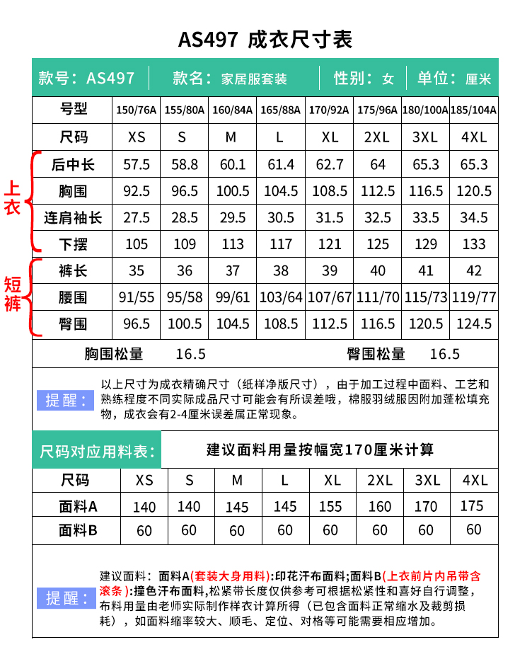 裁缝学苑AS497带胸垫短袖家居服套装纸样女装短袖短裤睡衣版型样板