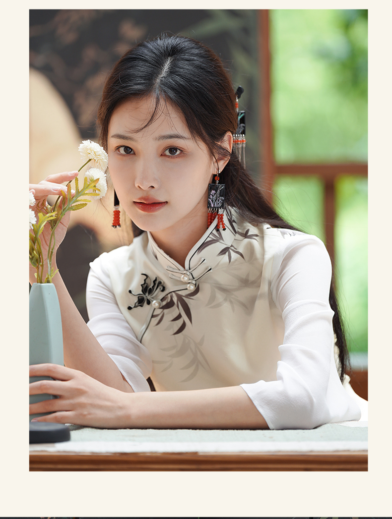 🦚拼接了半透飘逸的雪纺七分袖,让肌肤若隐若现,增加了朦胧感,更显仙美。