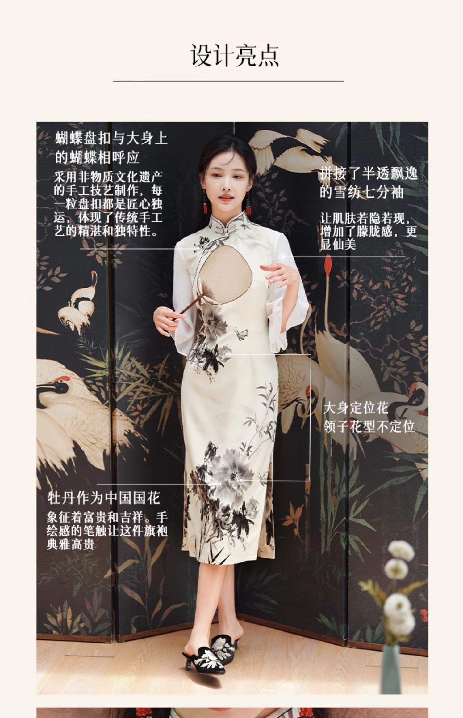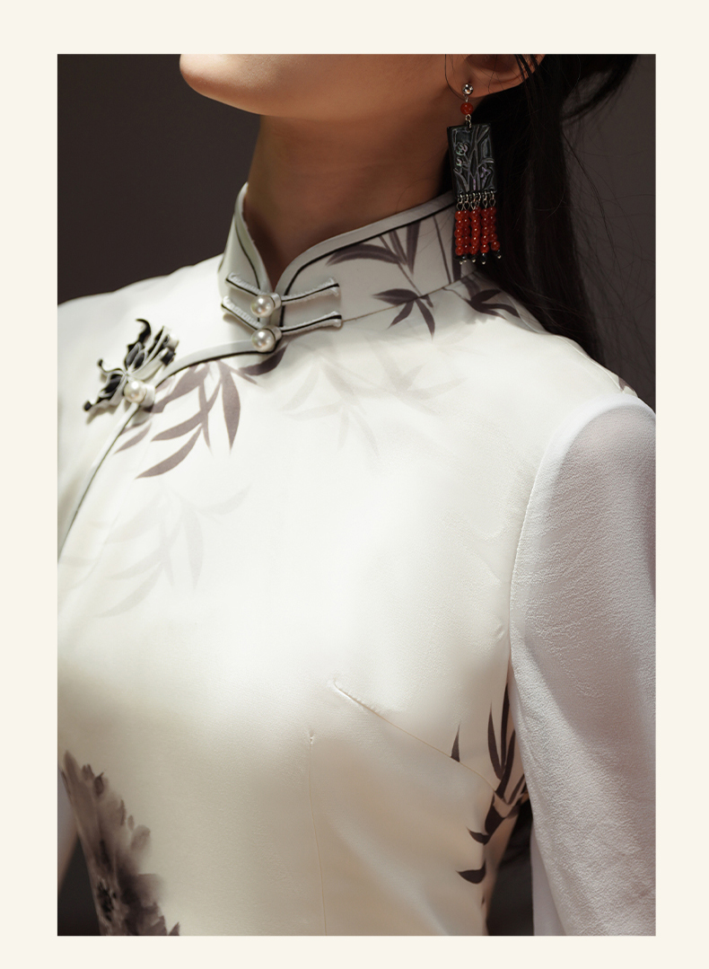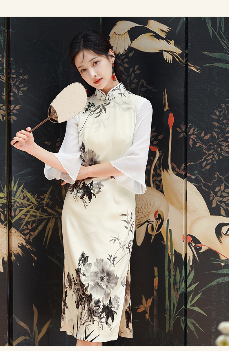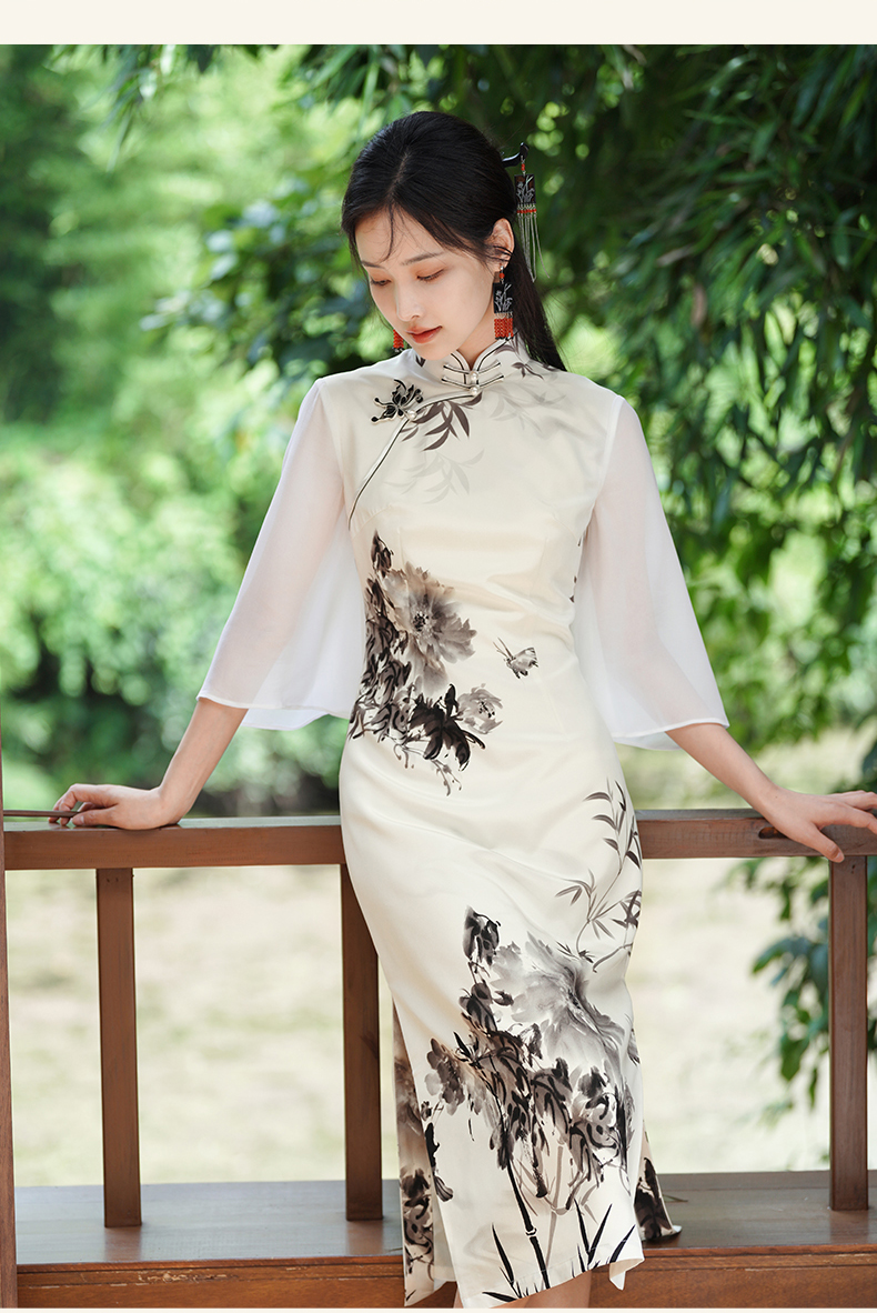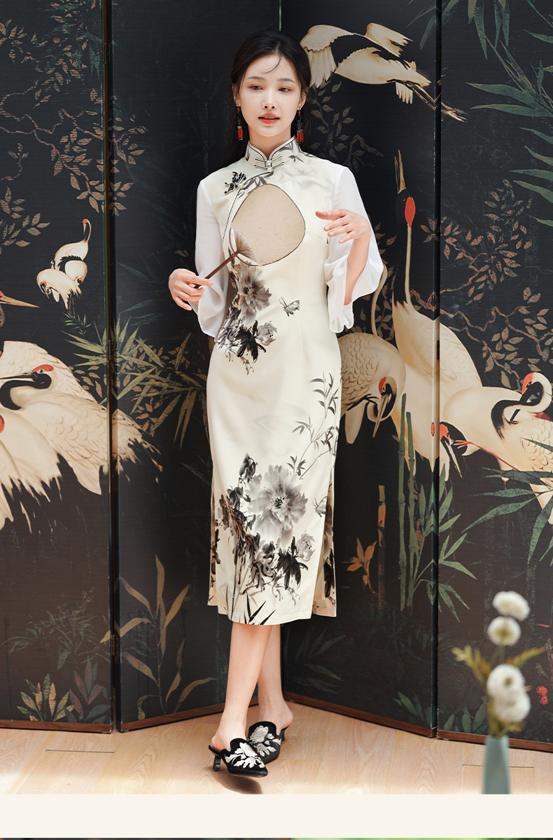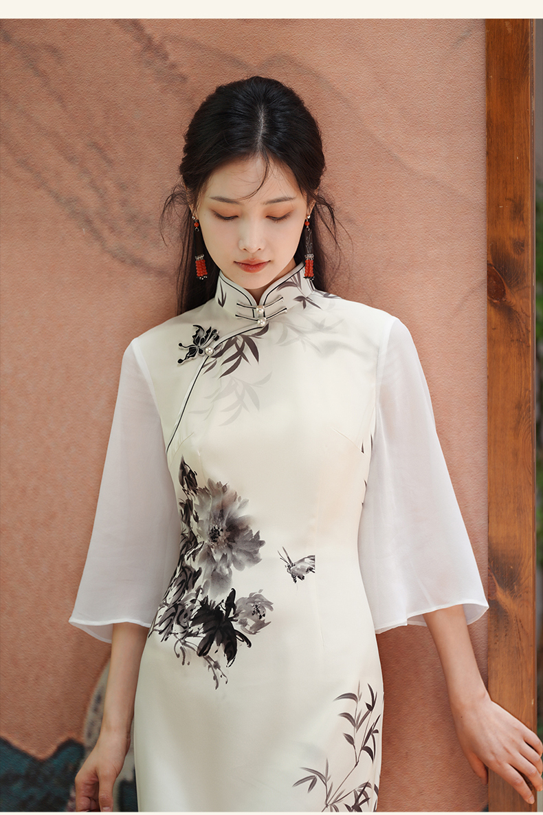 🦚中华瑰宝非遗蝴蝶盘扣,水墨牡丹花,手绘的的笔触让这件旗袍更加典雅高贵。
