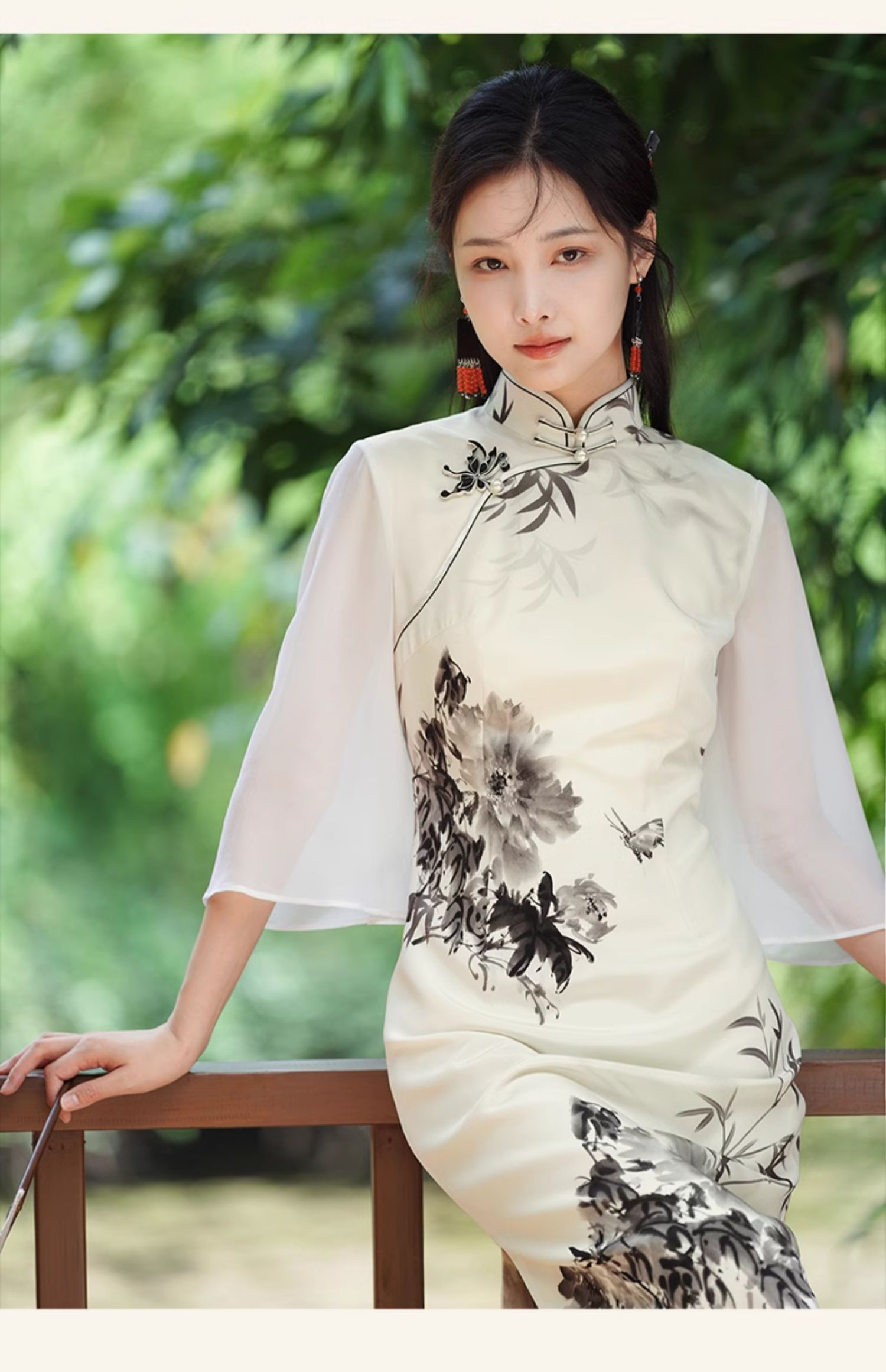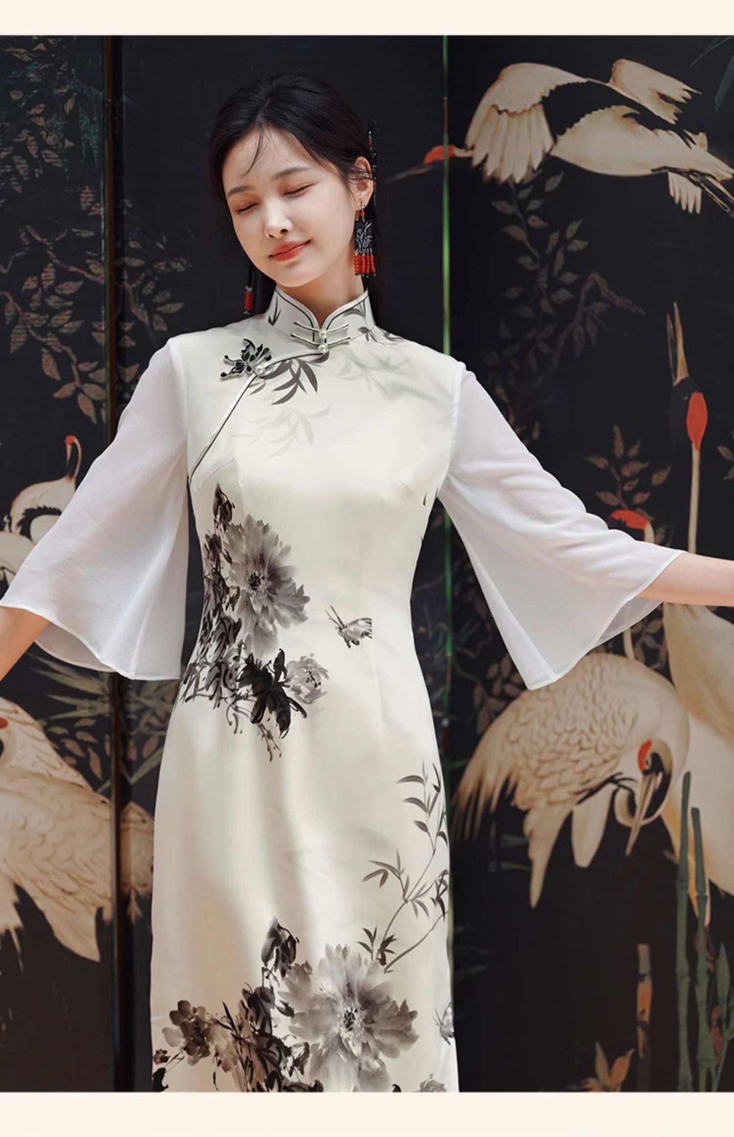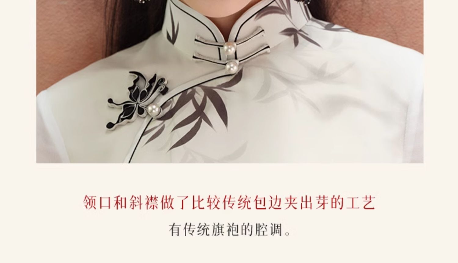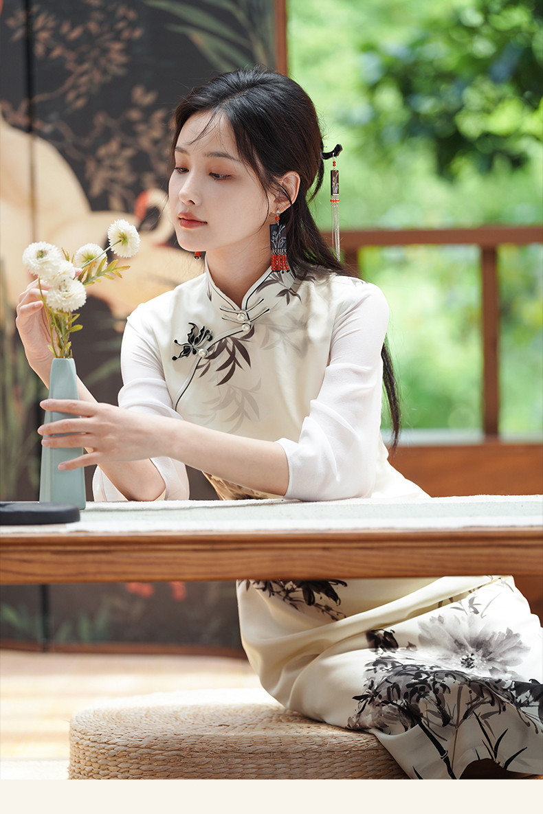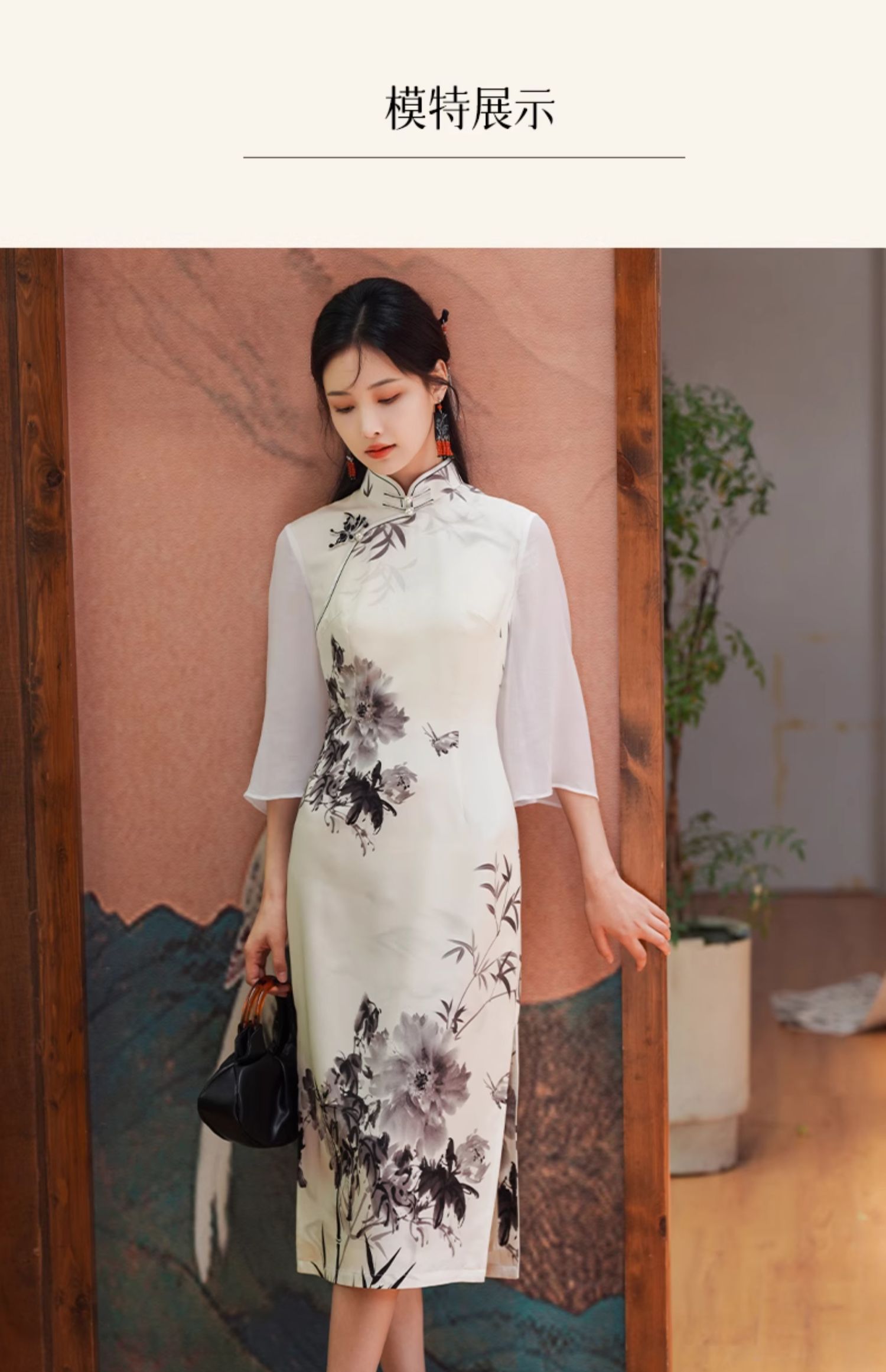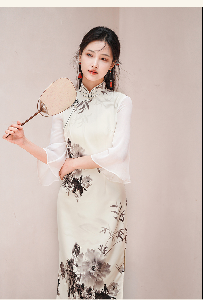 🦚中华瑰宝非遗蝴蝶盘扣,水墨牡丹花,手绘的的笔触让这件旗袍更加典雅高贵。