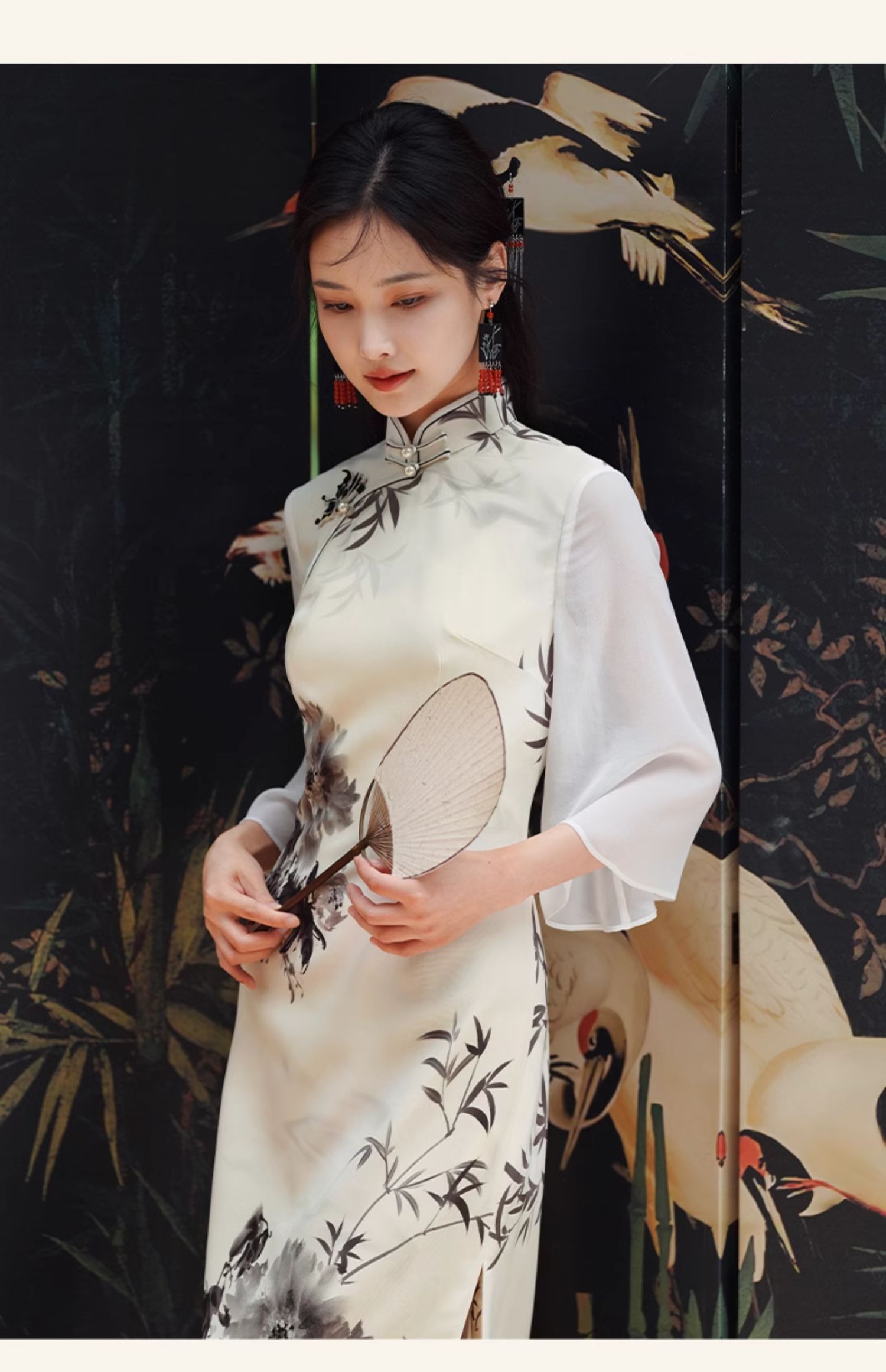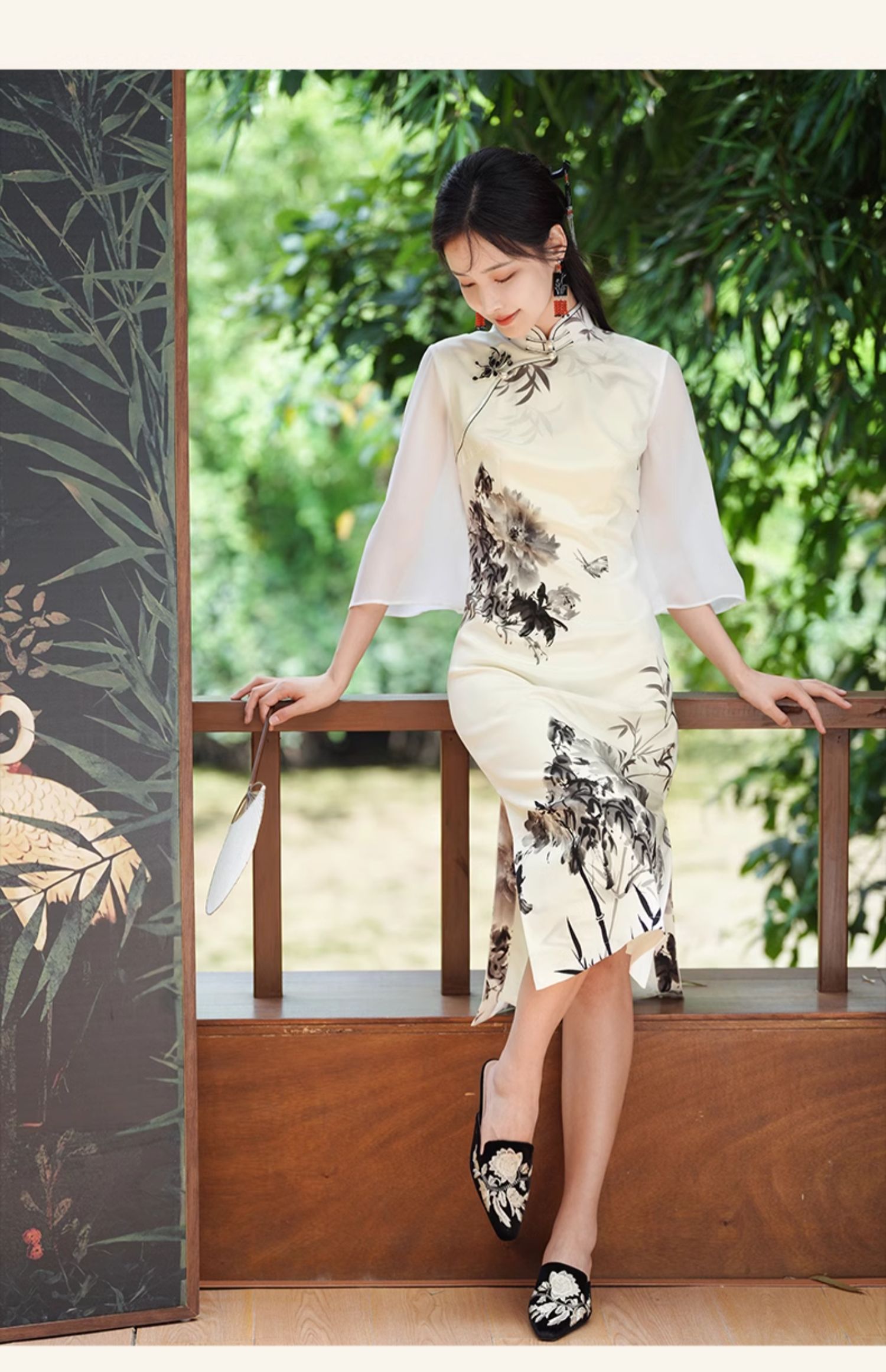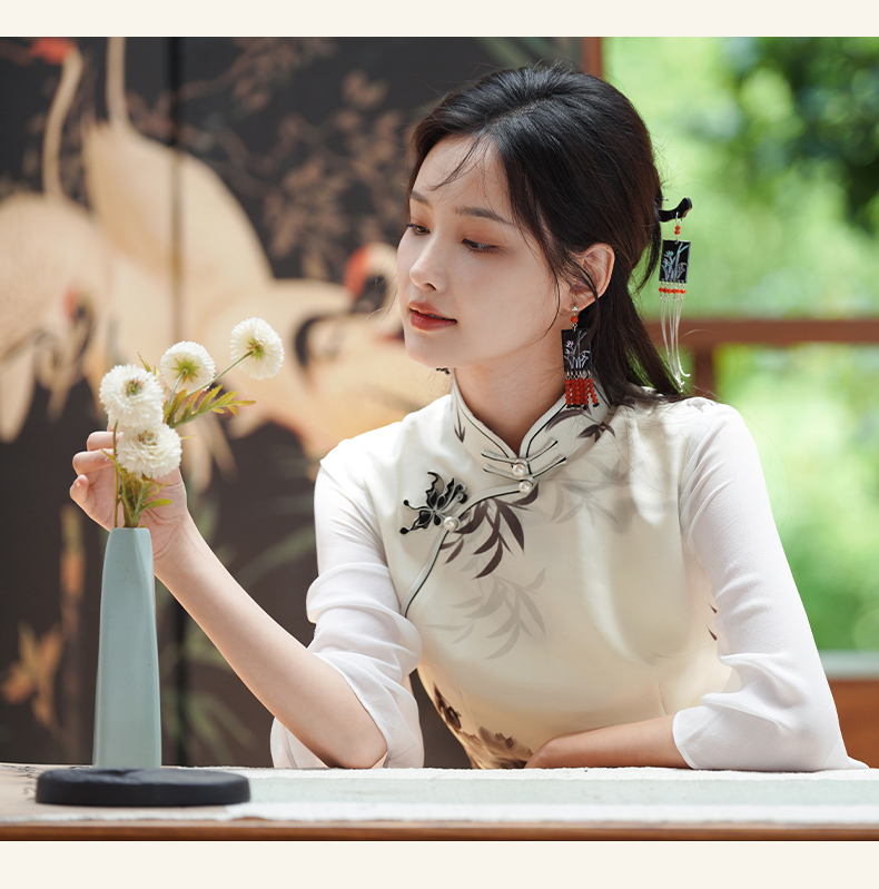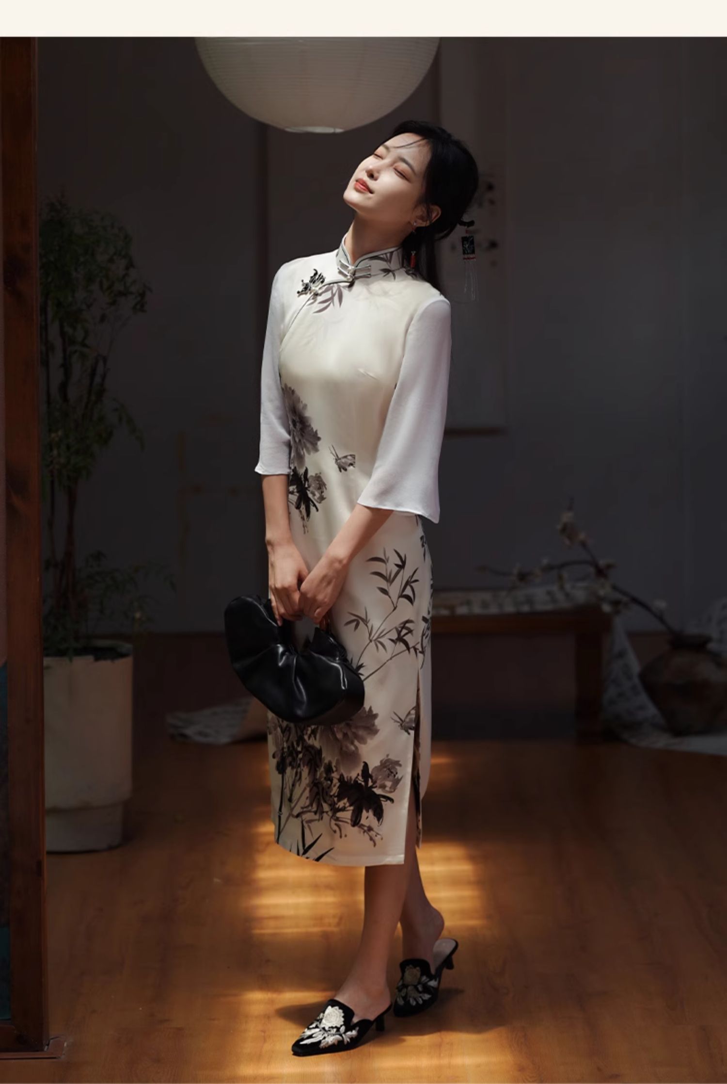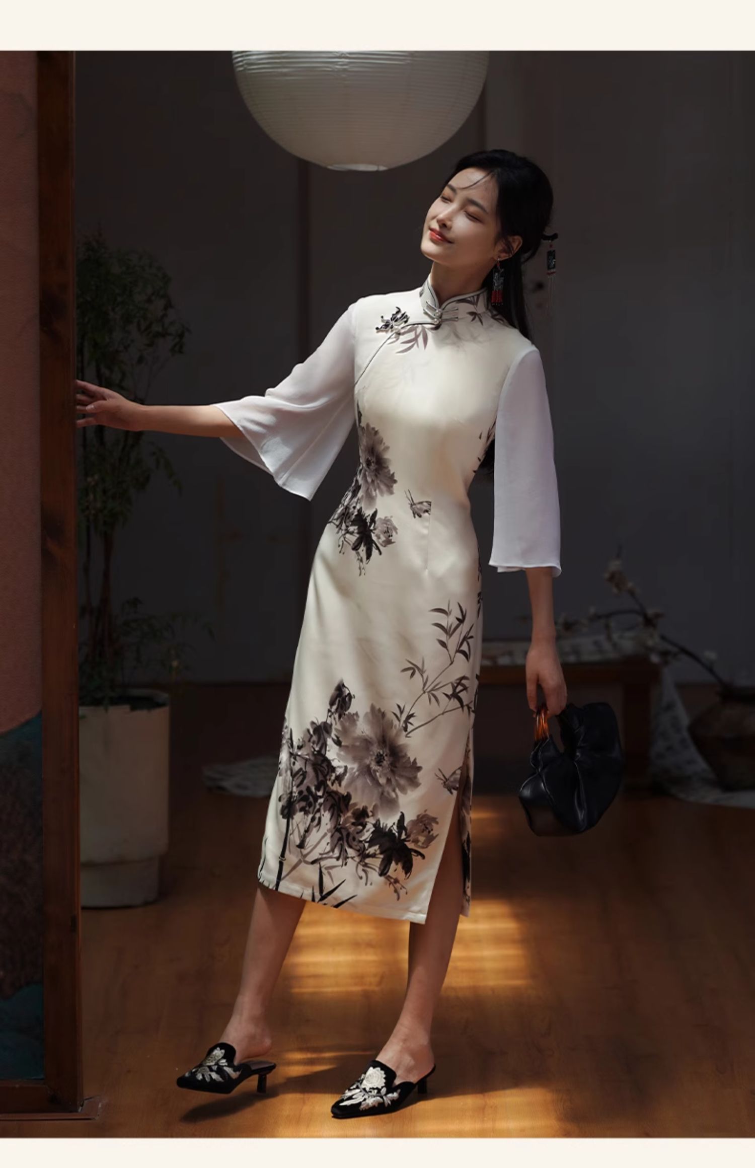 🦚中华瑰宝非遗蝴蝶盘扣,水墨牡丹花,手绘的的笔触让这件旗袍更加典雅高贵。