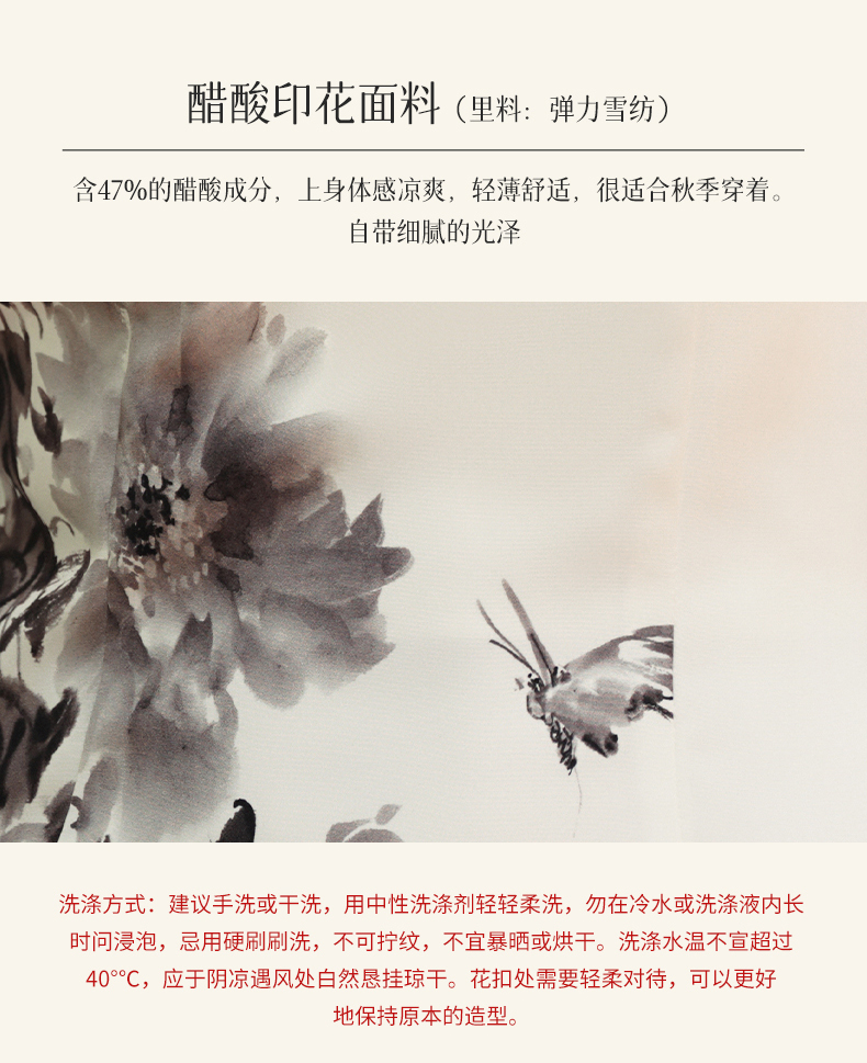 🦚水墨牡丹醋酸针织印花,含40%的醋酸成分,上身体感凉爽,轻薄舒适,很适合夏日穿着。针织弹性很大,不会起皱。