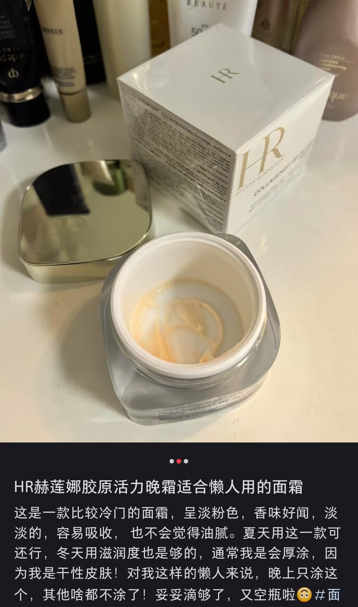 赫莲娜胶原蛋白丰盈晚霜,晚霜滋润锁水不油腻,霜感质地超强修护。