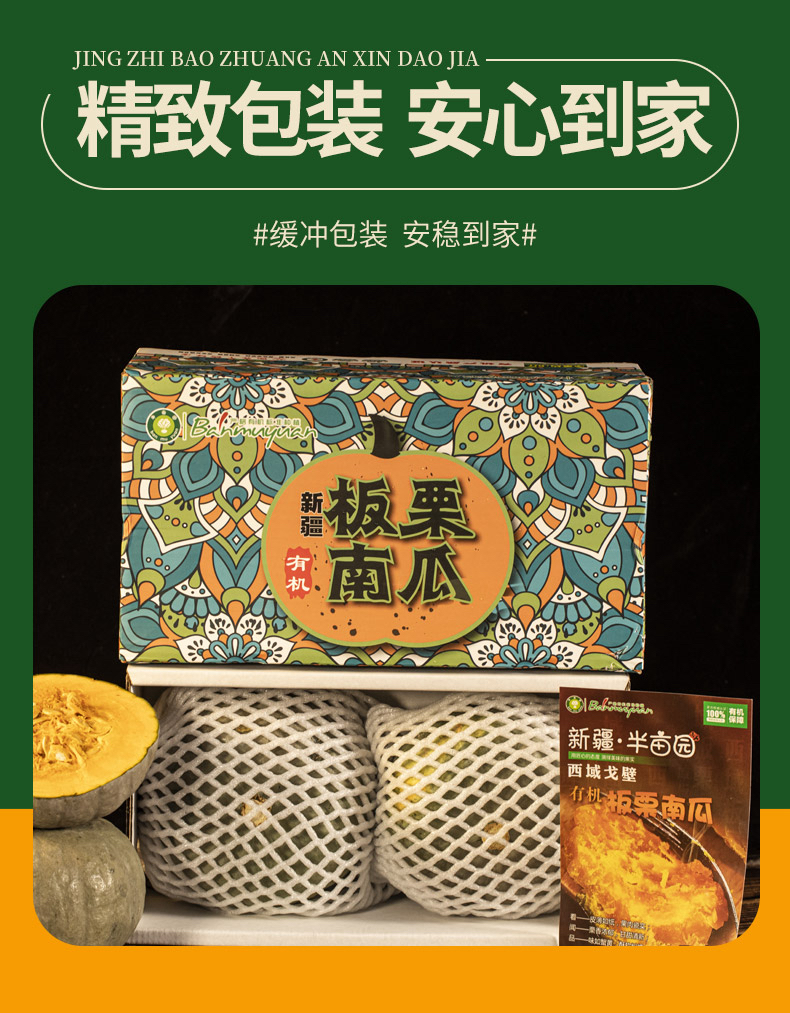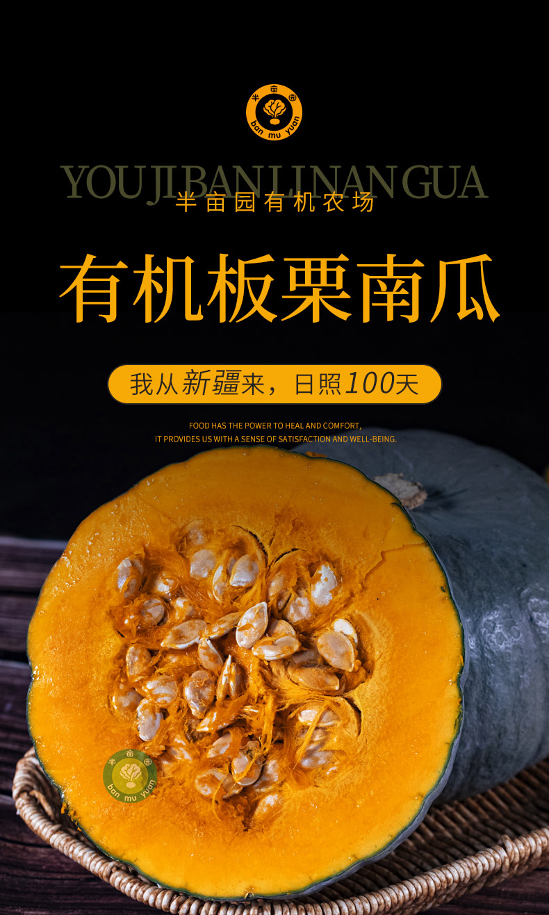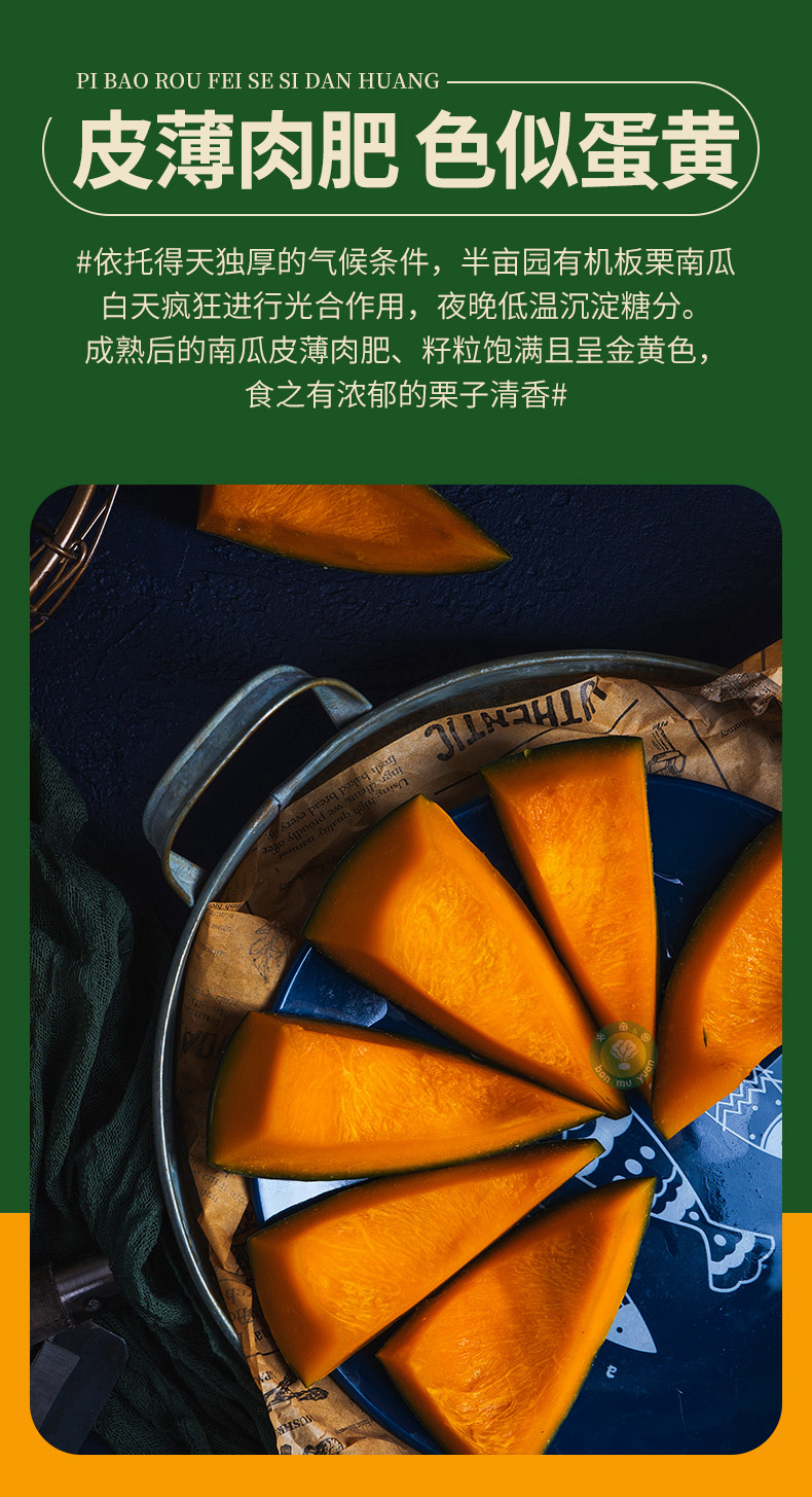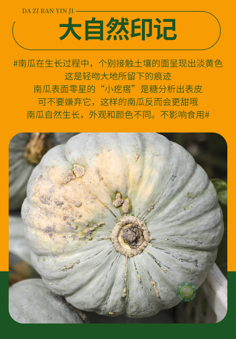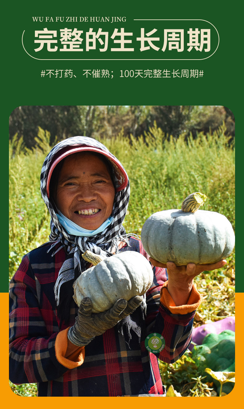 【产品特点】100天+完整的生长周期;已获得有机认证、天然富硒地种植、具备供港资质;每一箱南瓜都有自己的有机追溯码;果形小巧玲珑、瓜纹清晰;瓤沙、粉面、干香细腻、带有板栗的味道