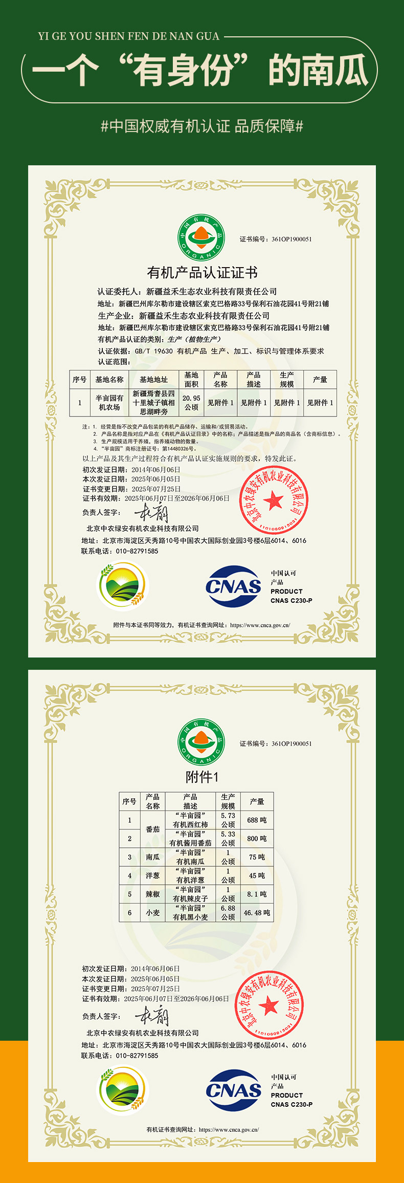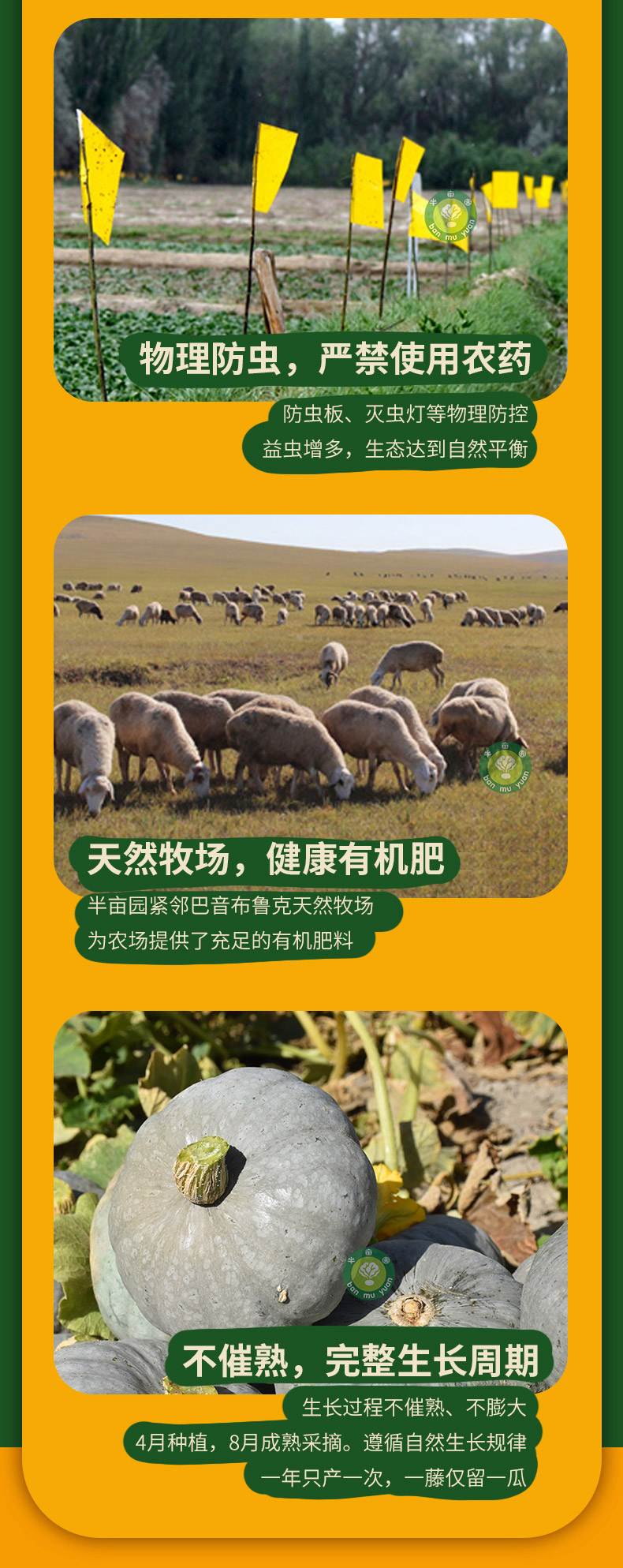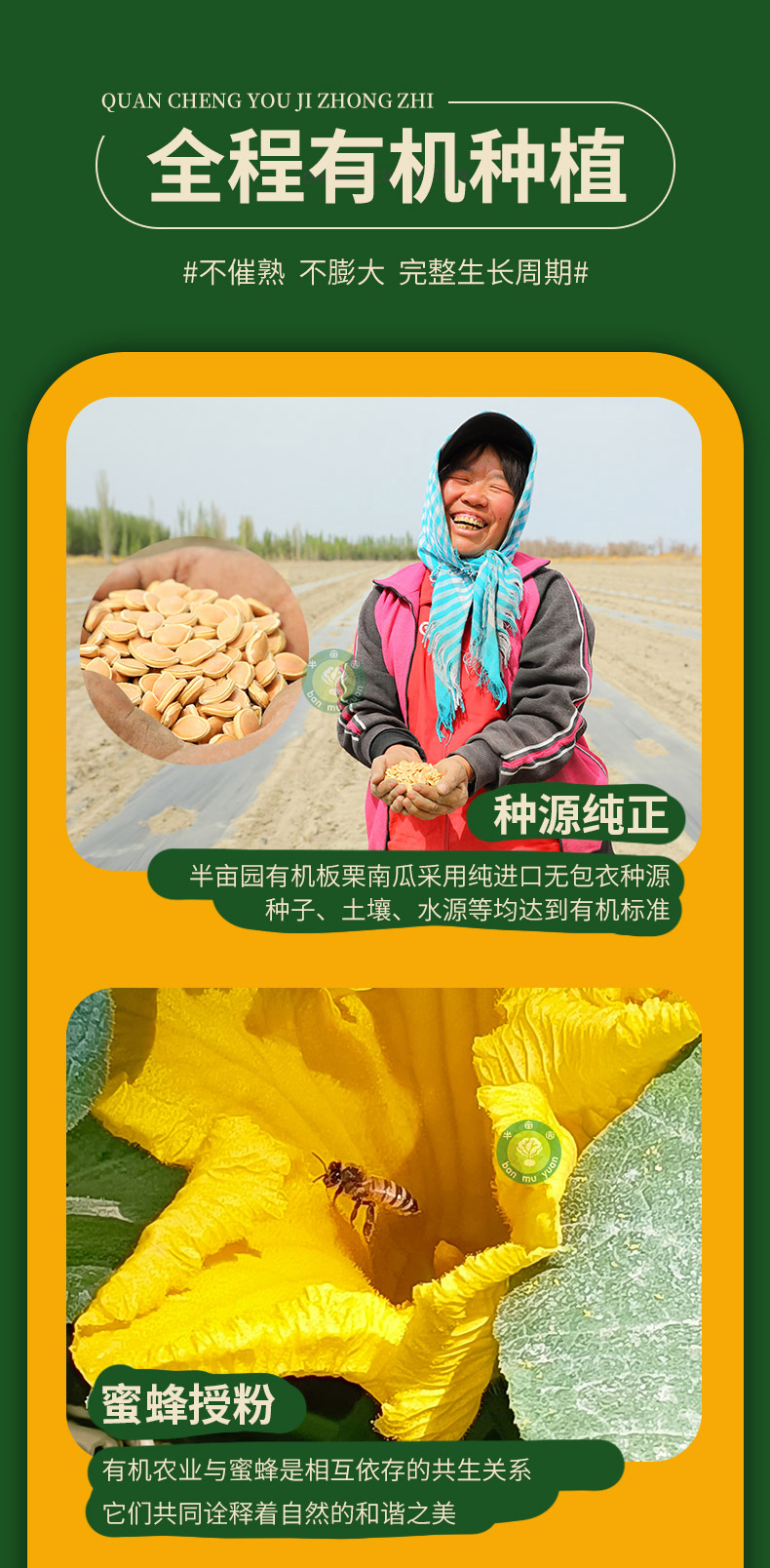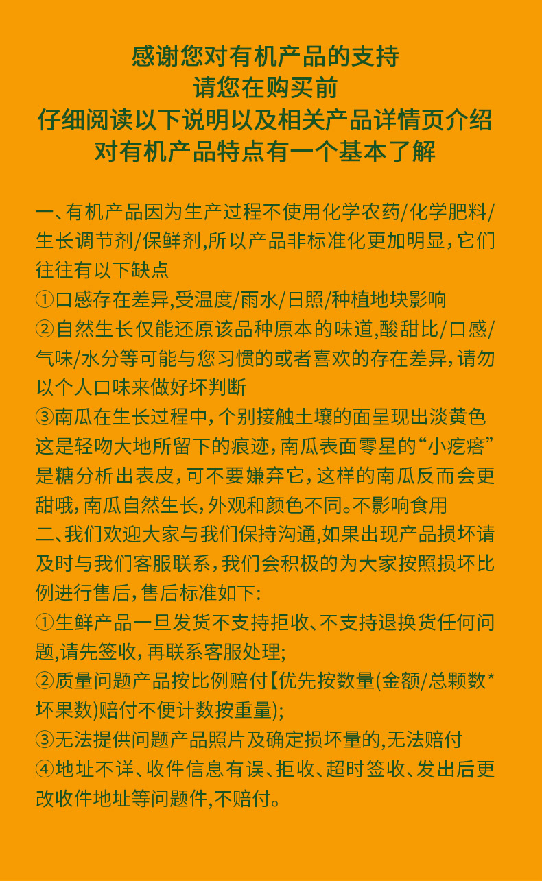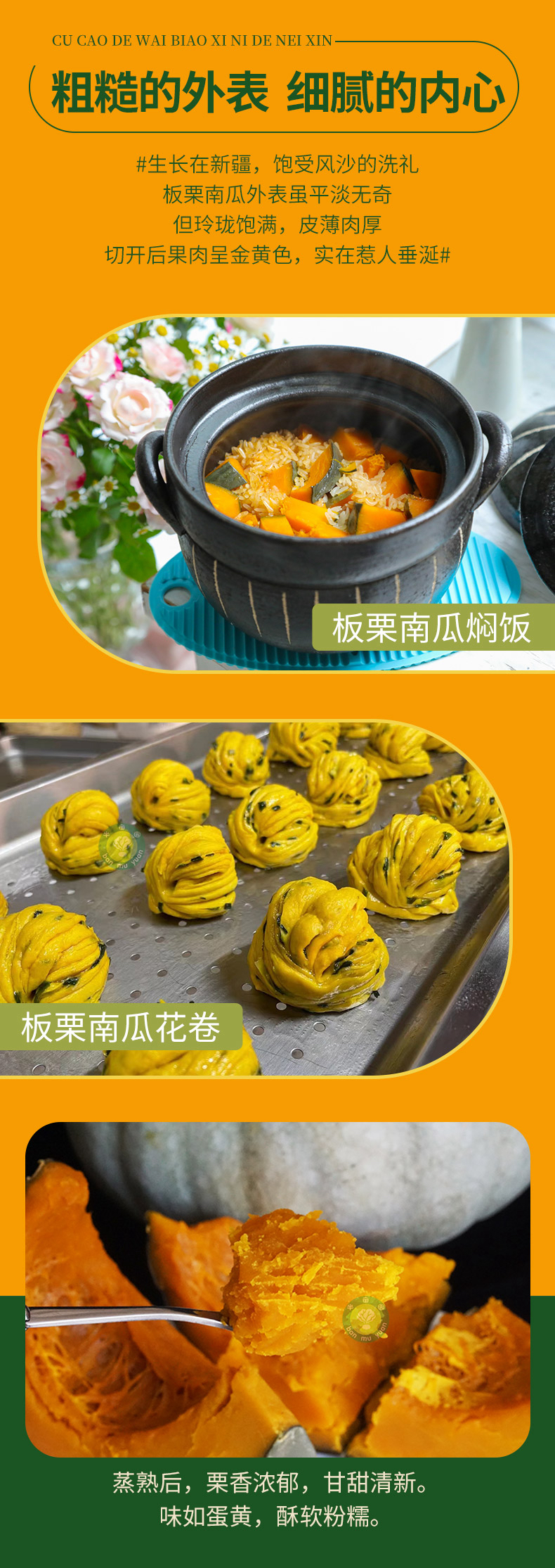 【产品特点】100天+完整的生长周期;已获得有机认证、天然富硒地种植、具备供港资质;每一箱南瓜都有自己的有机追溯码;果形小巧玲珑、瓜纹清晰;瓤沙、粉面、干香细腻、带有板栗的味道