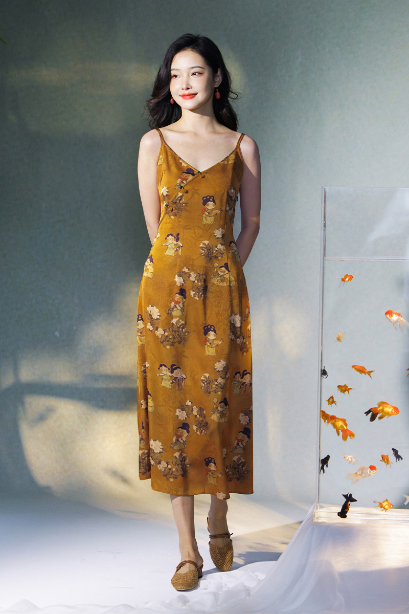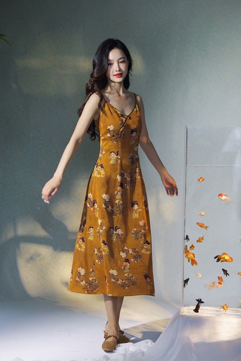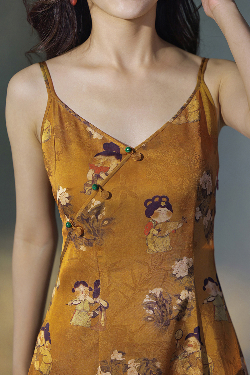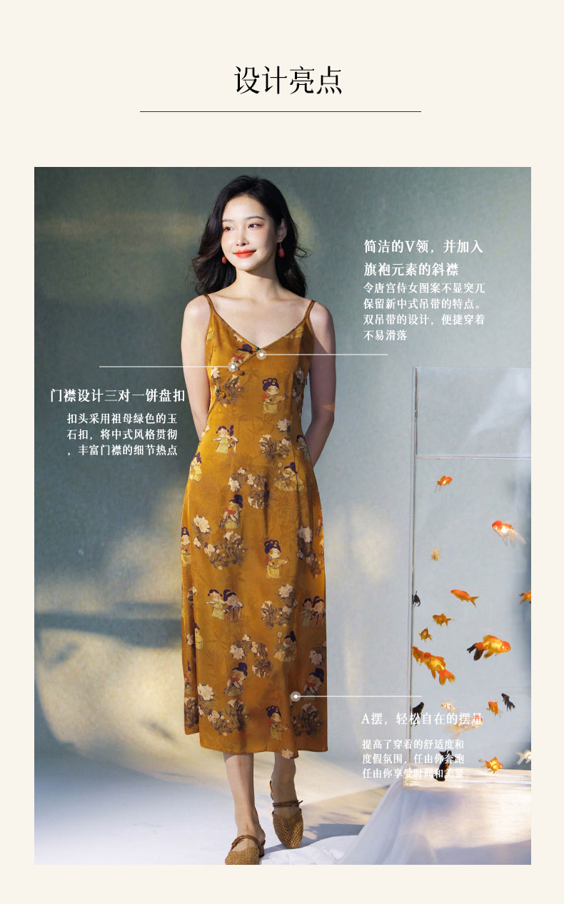 ▫ V领斜襟:简洁的V字领型搭配旗袍式斜襟剪裁,巧妙中和侍女图的繁复感,呼应新中式内核。双吊带设计如侍女发髻垂落的流苏,便捷穿脱不滑落,举手投足间皆是风情。