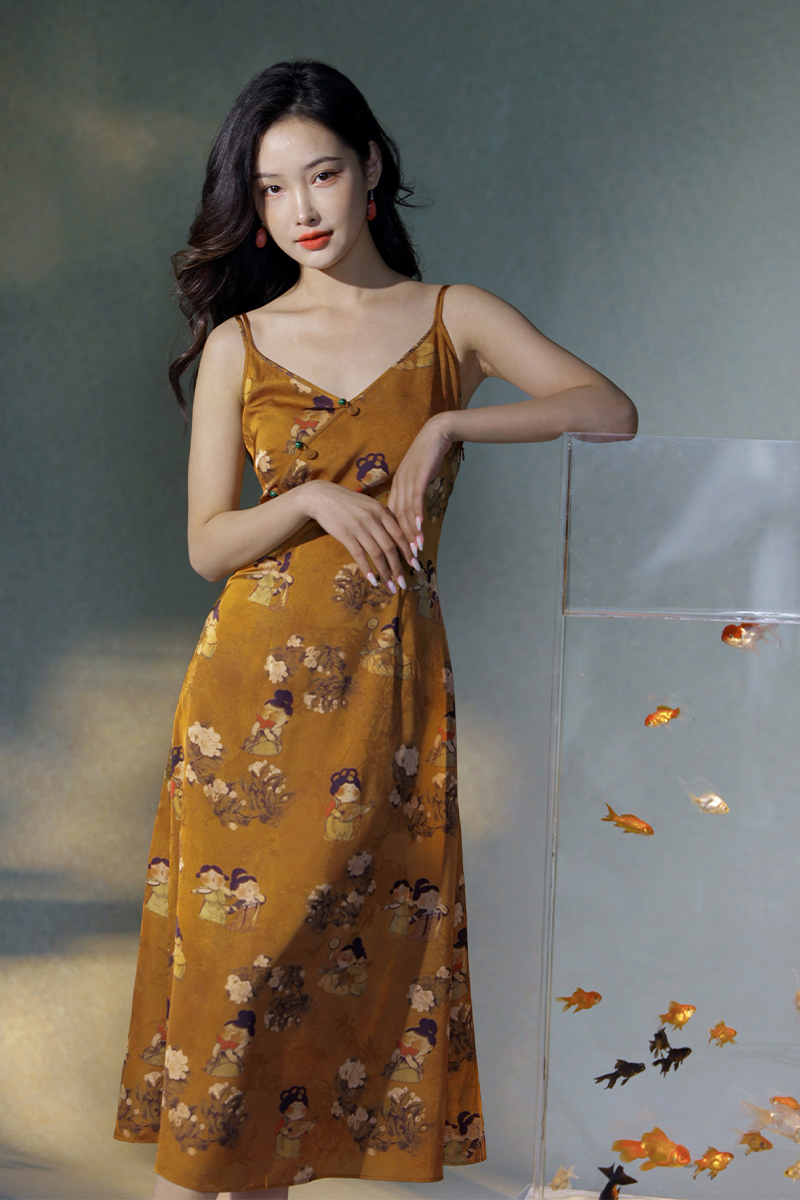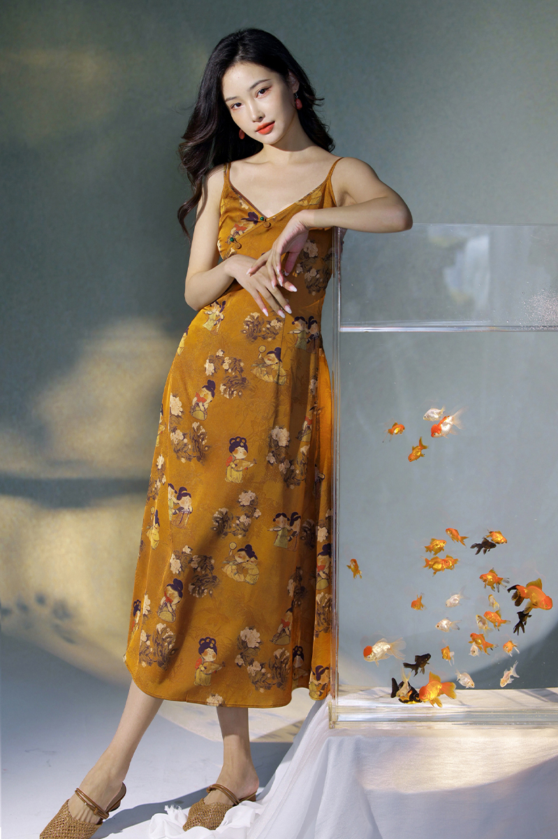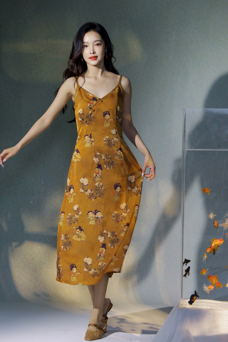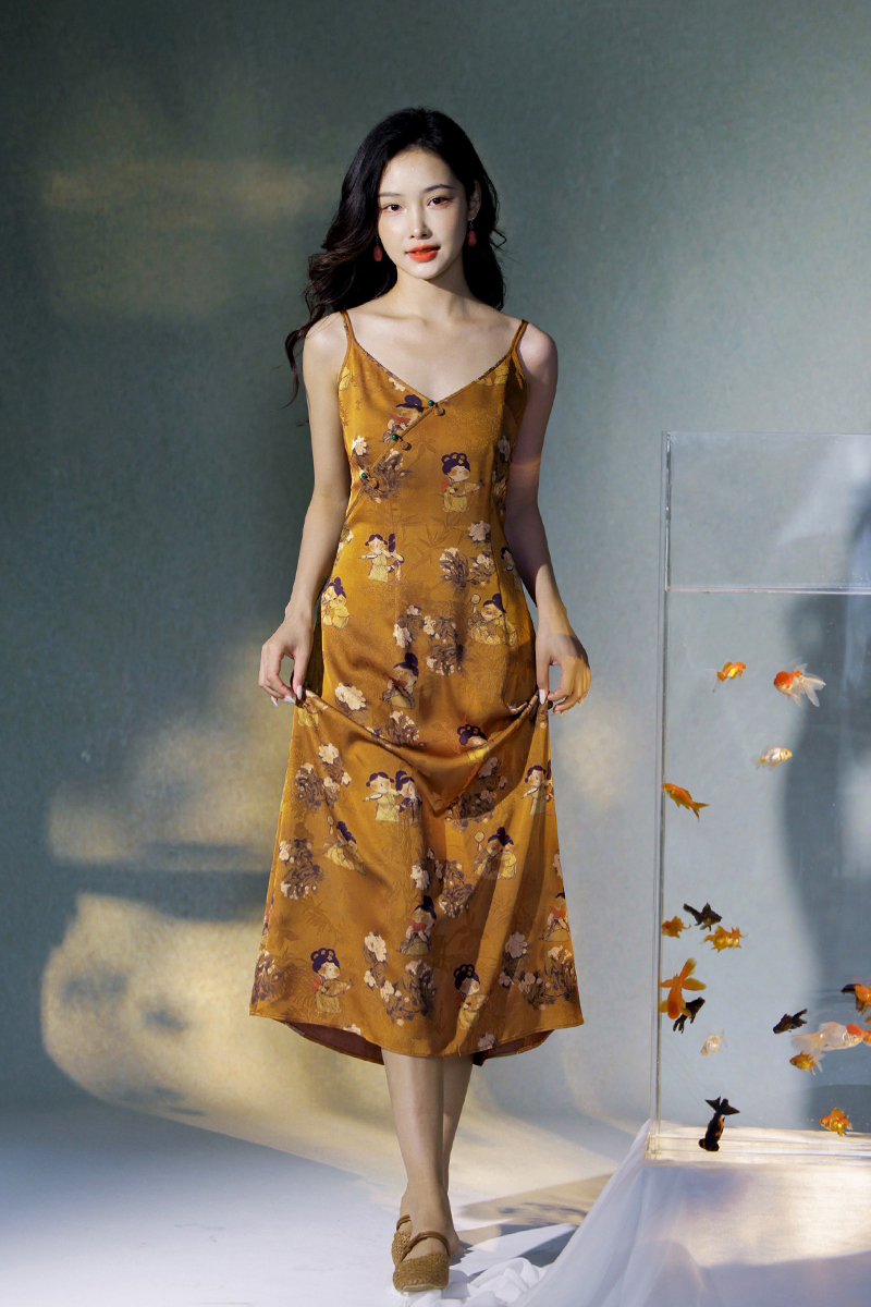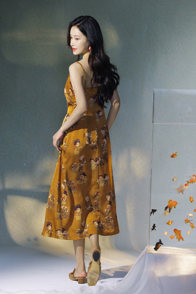 ▫ V领斜襟:简洁的V字领型搭配旗袍式斜襟剪裁,巧妙中和侍女图的繁复感,呼应新中式内核。双吊带设计如侍女发髻垂落的流苏,便捷穿脱不滑落,举手投足间皆是风情。