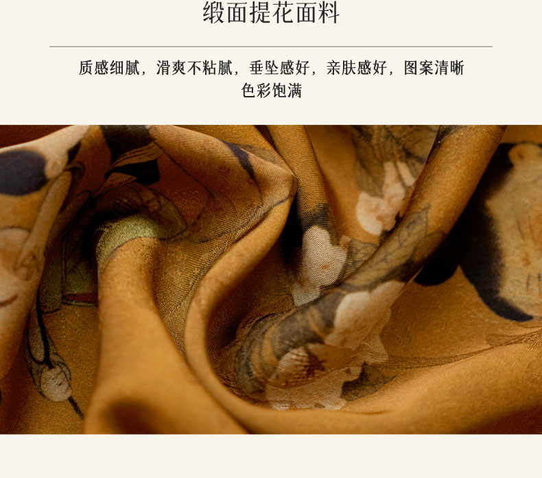 ▫ 金棕缎面提花工艺:比土黄色贵气,比姜黄色耐看,哑光质感不反光,秒变“冷白皮”!暗纹若隐若现,丝滑缎面垂坠成诗,亲肤透气不粘腻,阳光下流转着琥珀般的光泽。