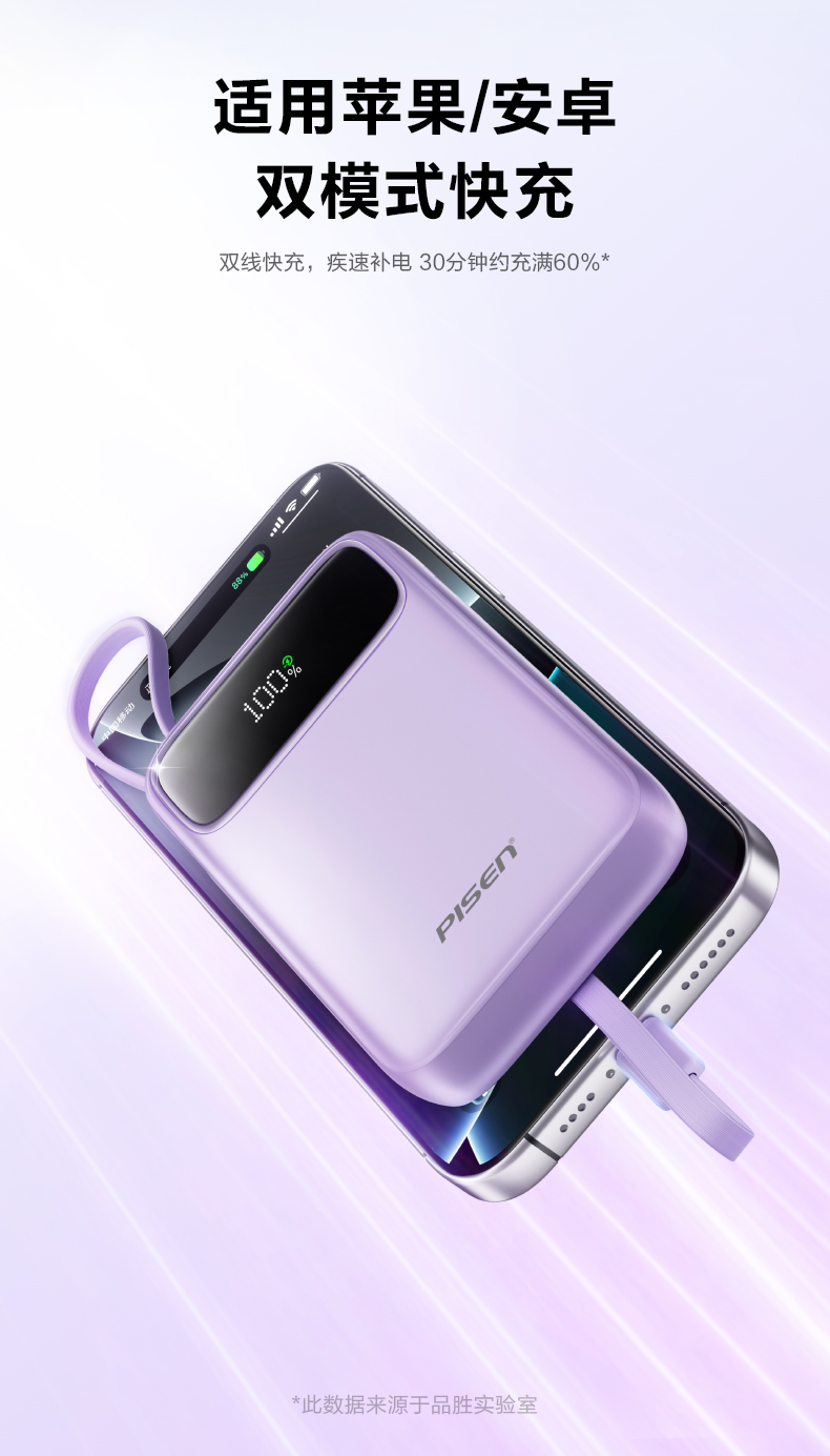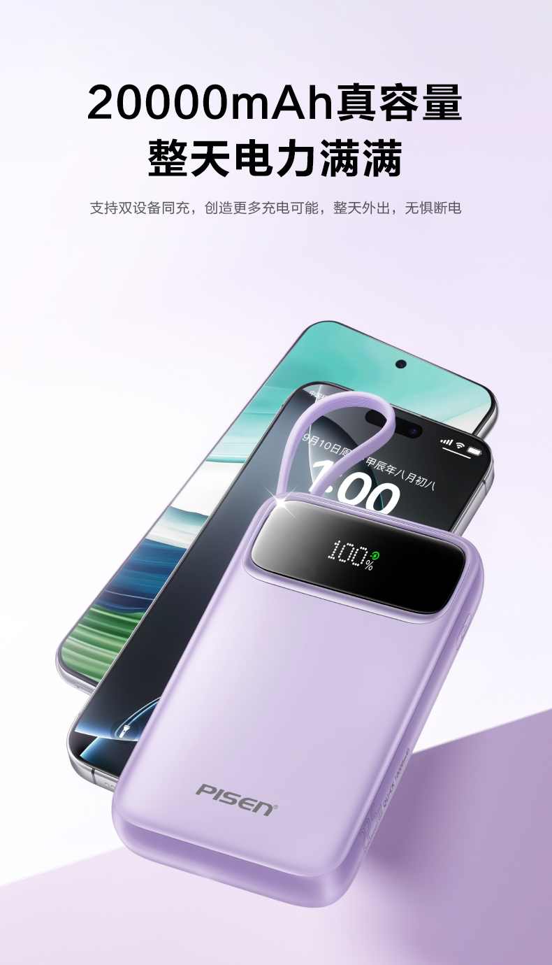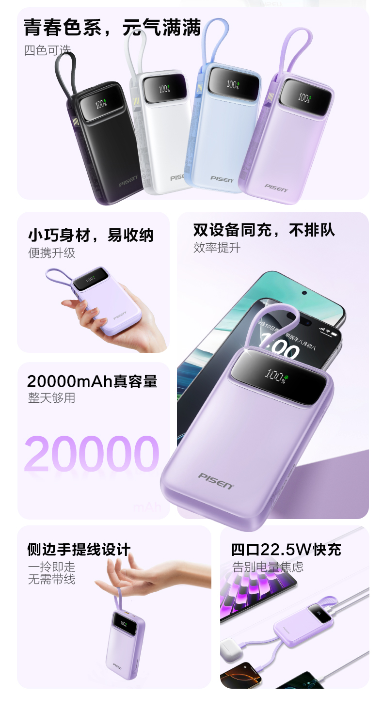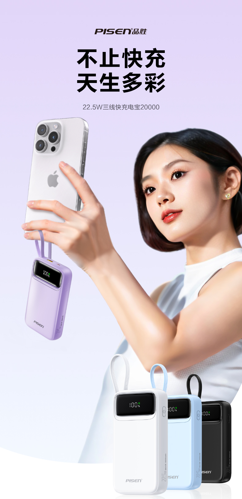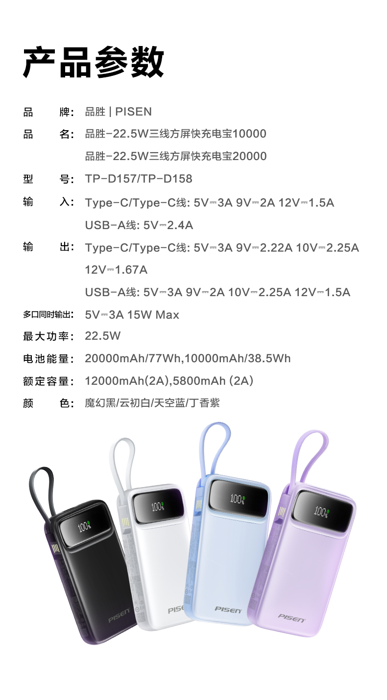 品胜 22.5W三线方屏快充电宝20000毫安 大容量自带C口/L口数据线 22.5W快充移动电源适用苹果/华为/小米/荣耀设备