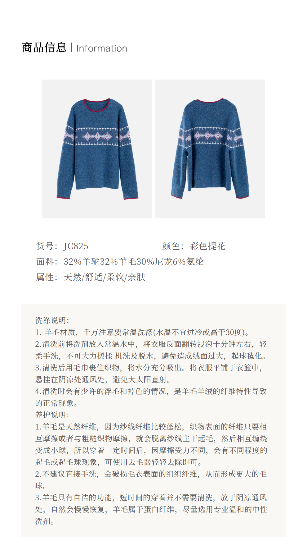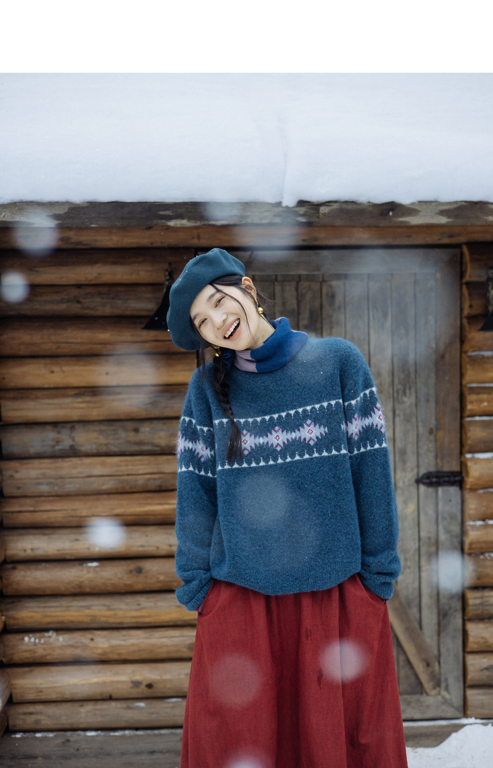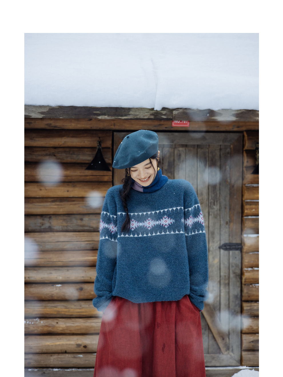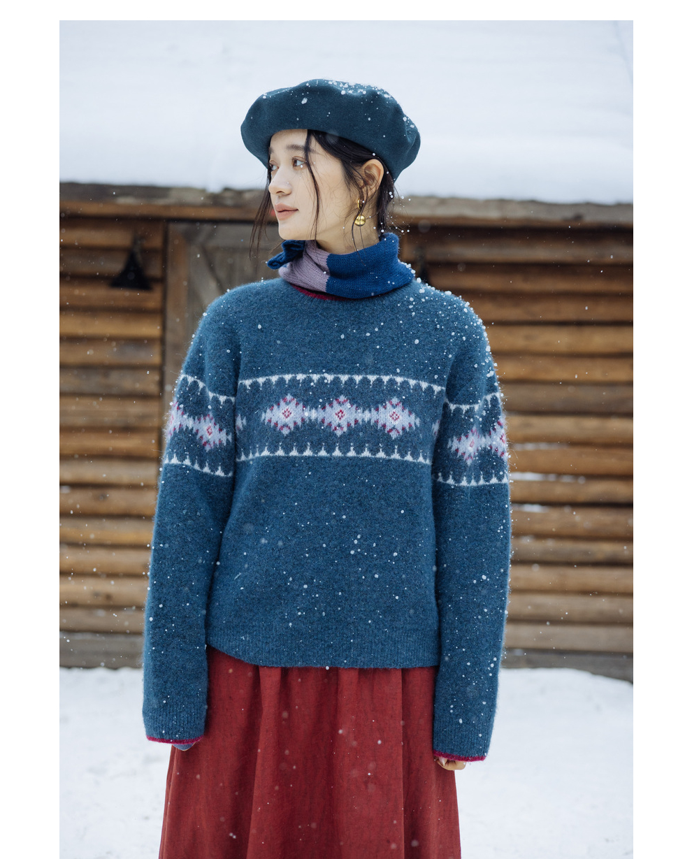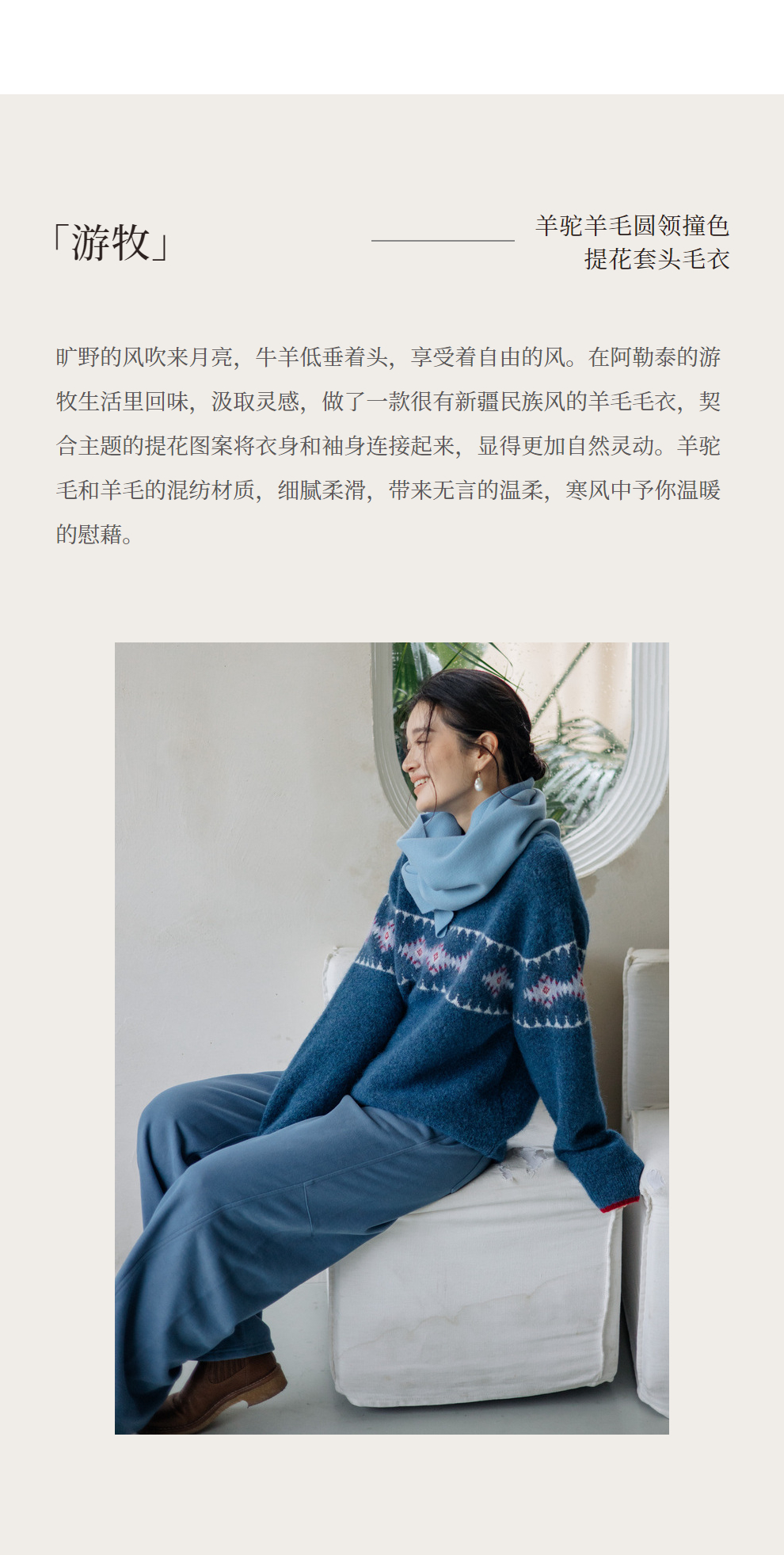 绽放旅行女装825朵/秋冬羊驼羊毛经典圆领撞色提花保暖套头毛衣