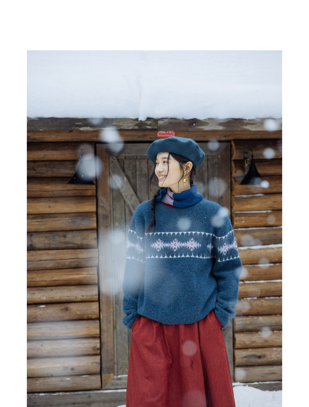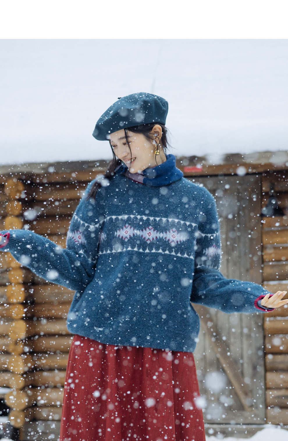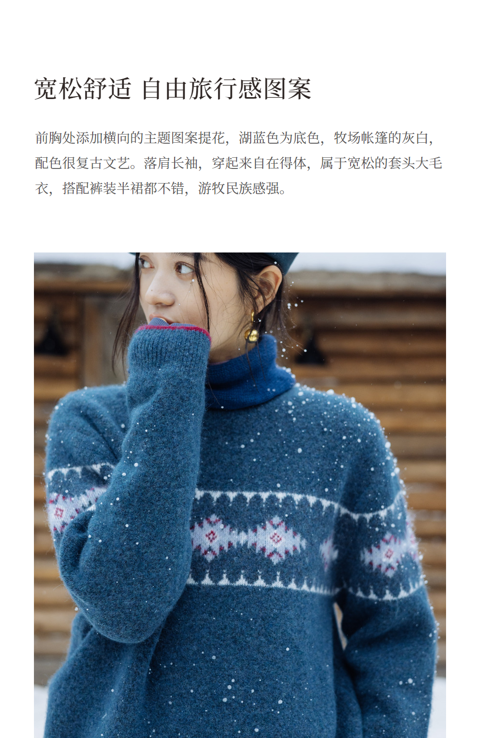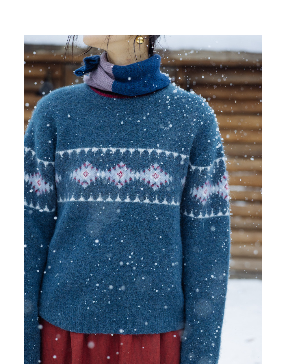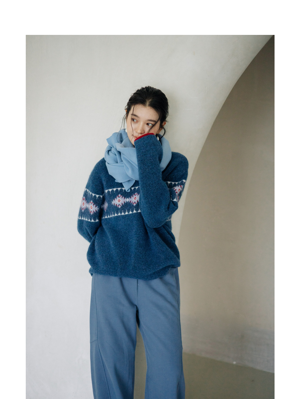 绽放旅行女装825朵/秋冬羊驼羊毛经典圆领撞色提花保暖套头毛衣