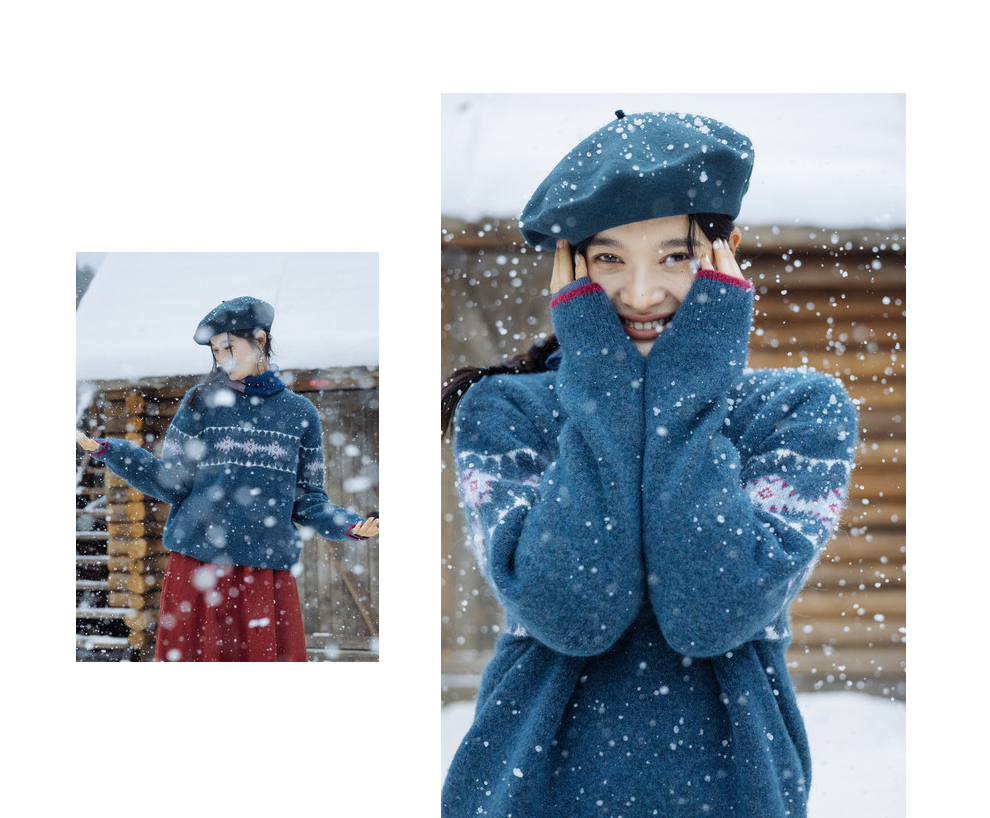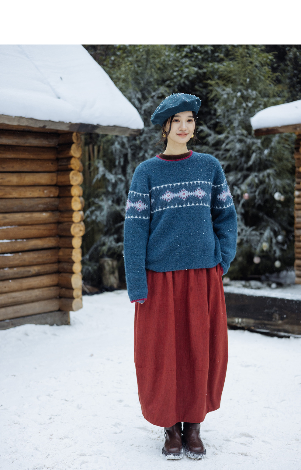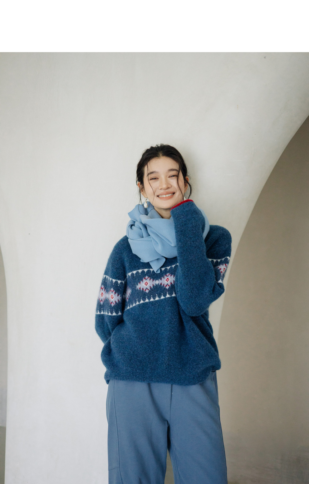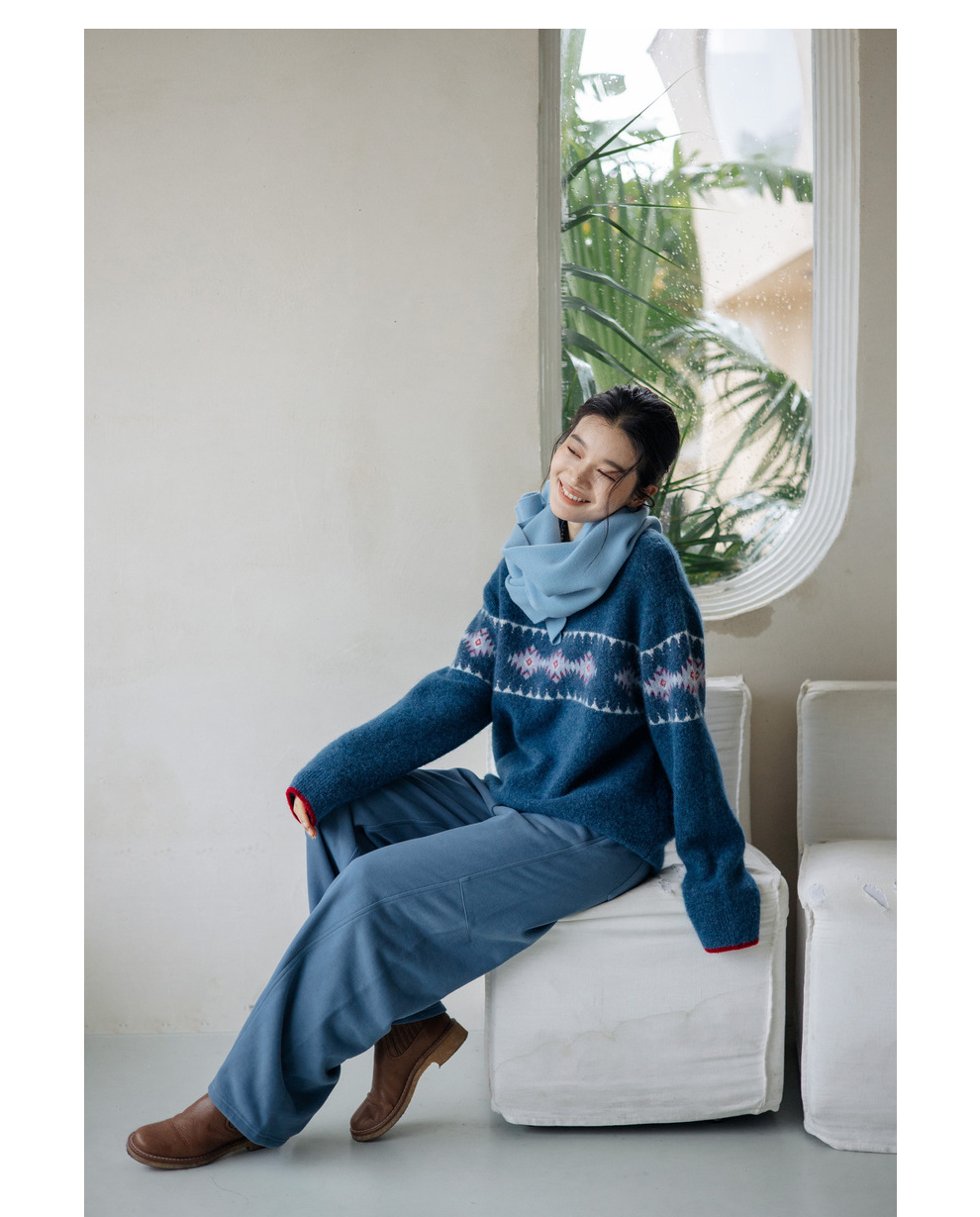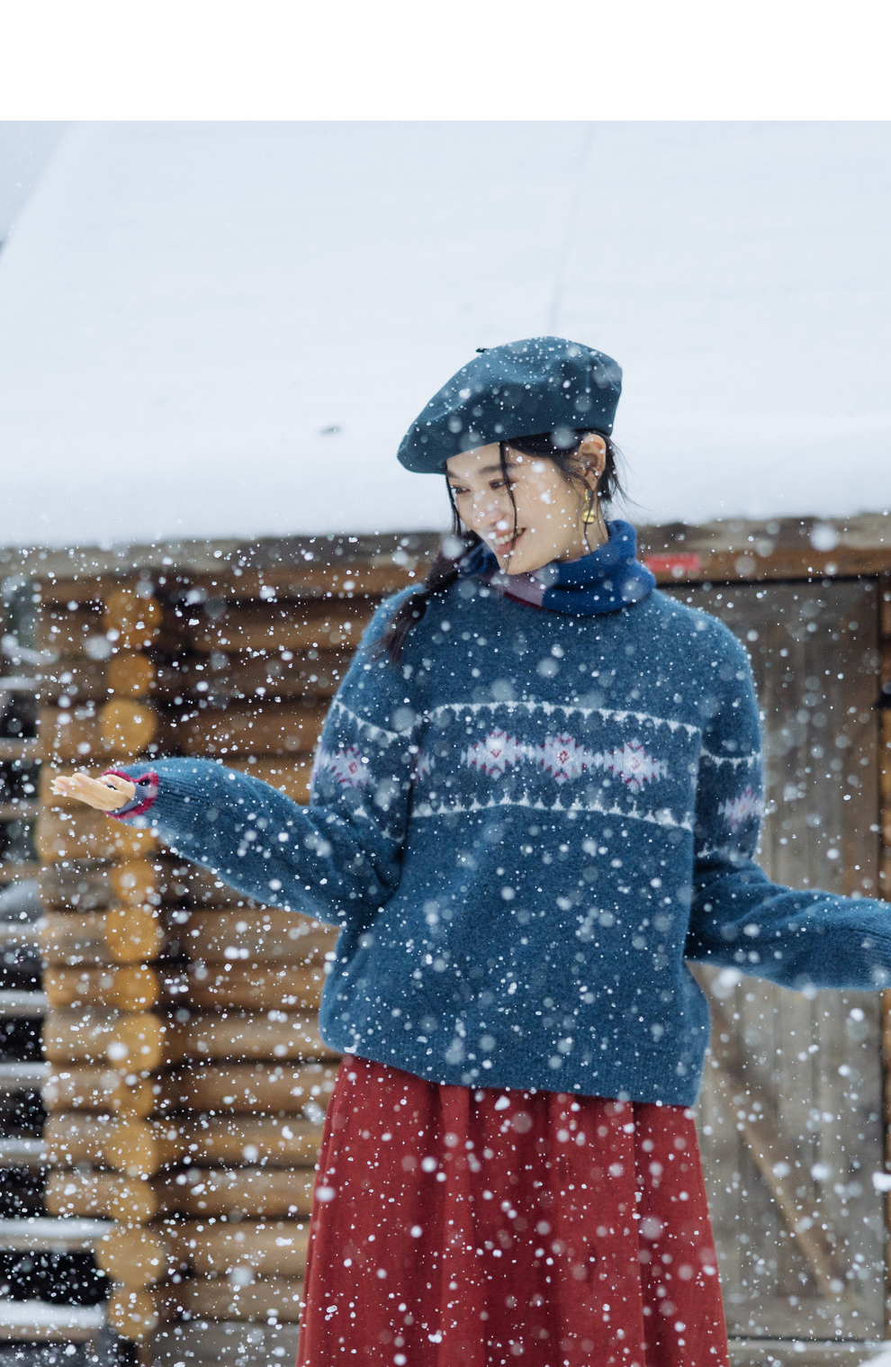 绽放旅行女装825朵/秋冬羊驼羊毛经典圆领撞色提花保暖套头毛衣