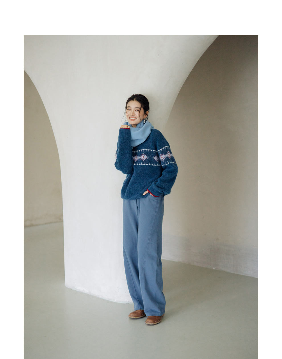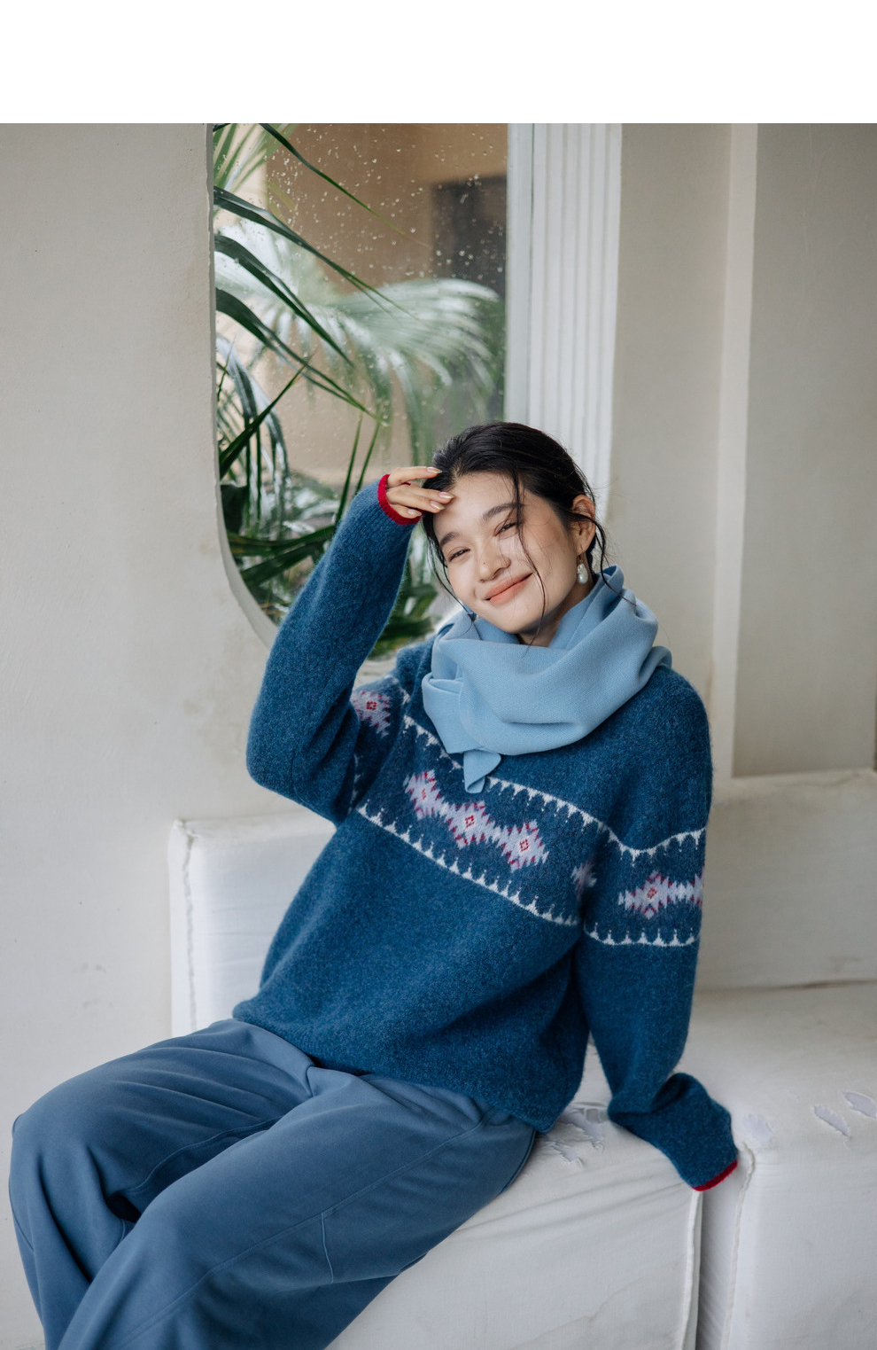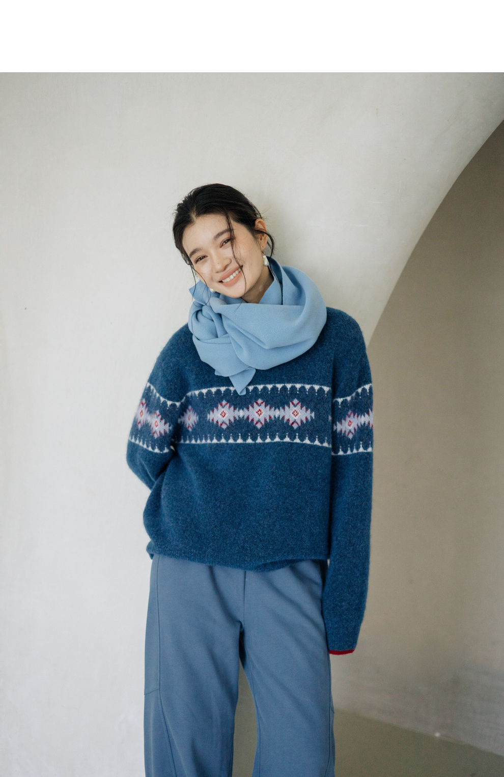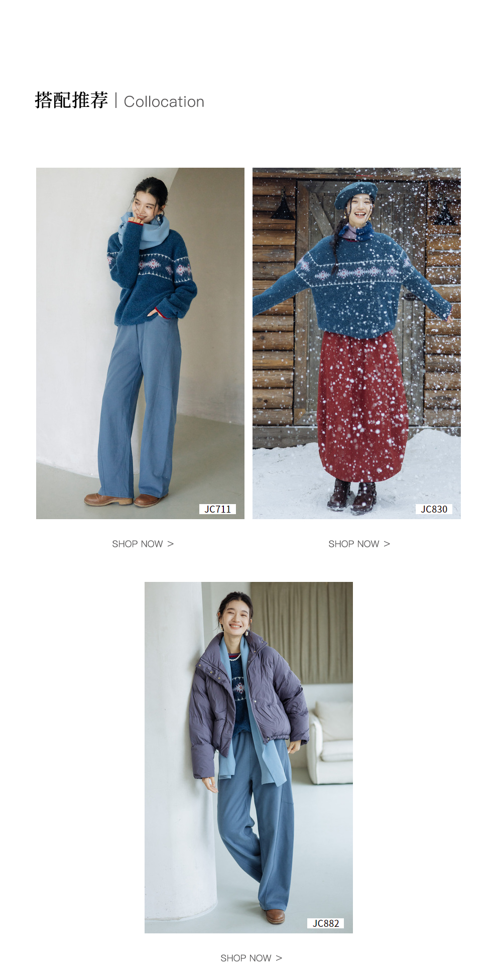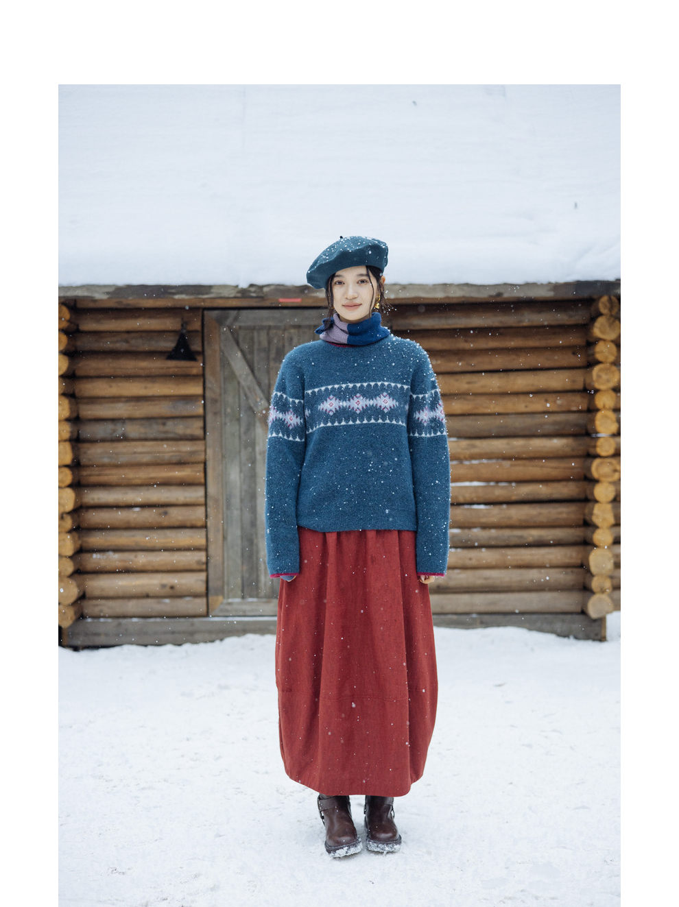 绽放旅行女装825朵/秋冬羊驼羊毛经典圆领撞色提花保暖套头毛衣
