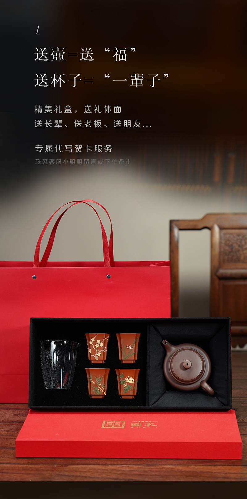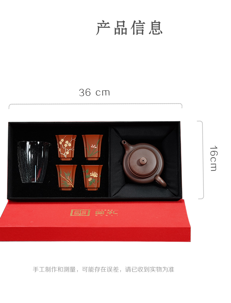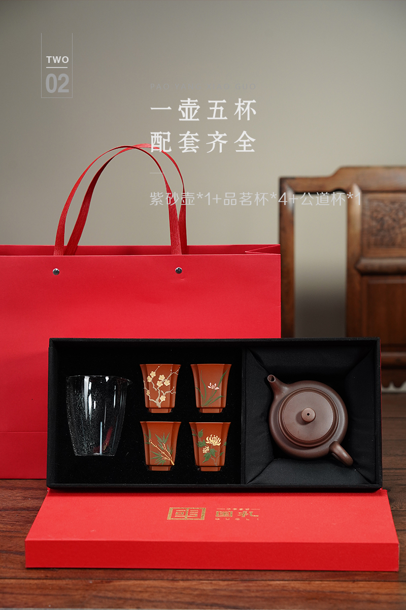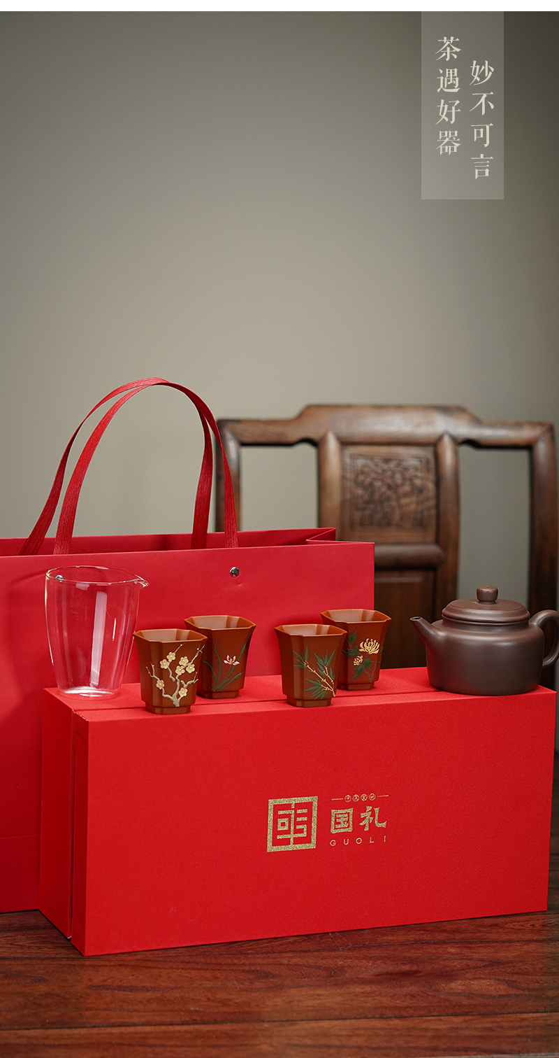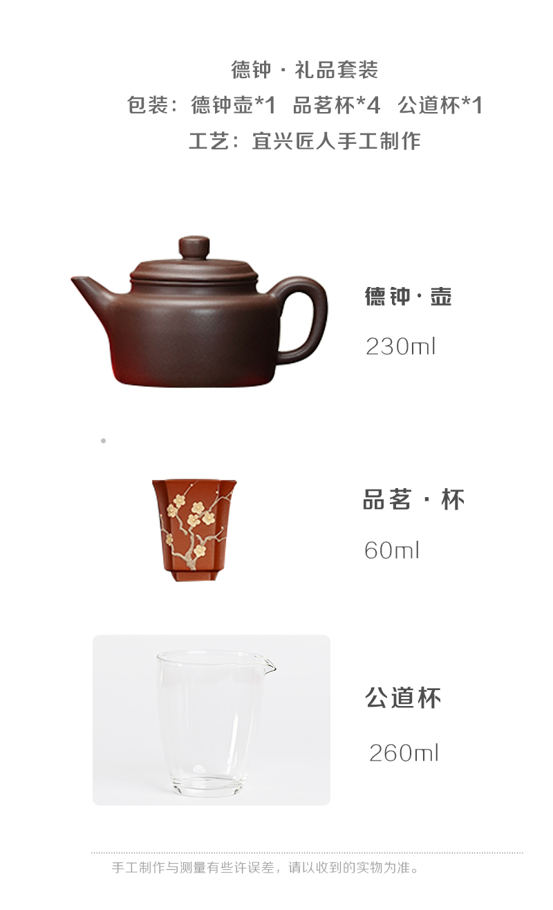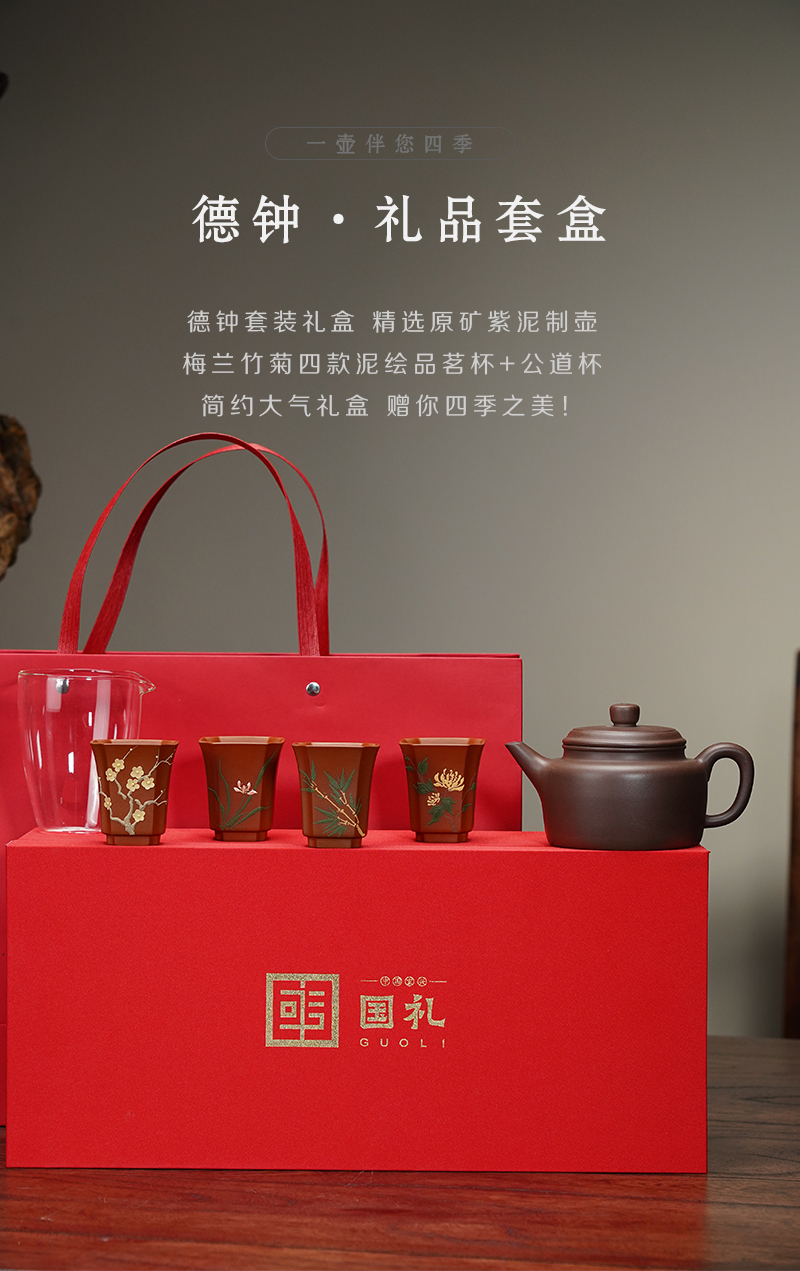 梵匠丨德钟 礼品套盒 德钟壶+梅兰竹菊品茗杯+公道杯 1壶4杯1公道杯 礼盒配手提袋 收藏紫砂艺术品 经典实用器型