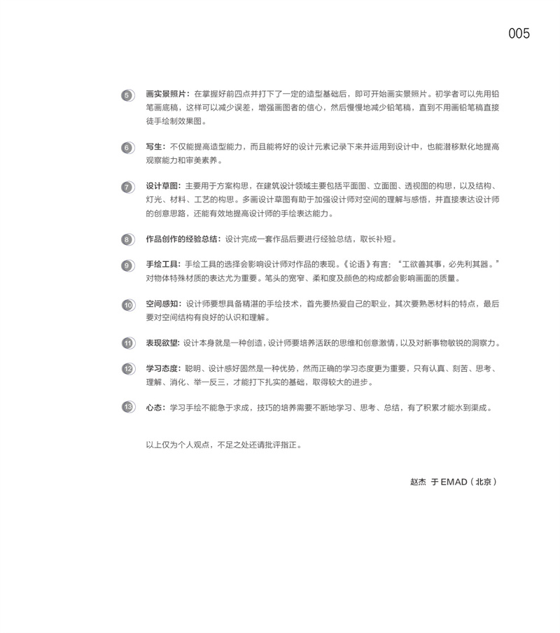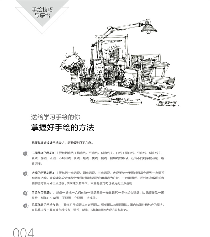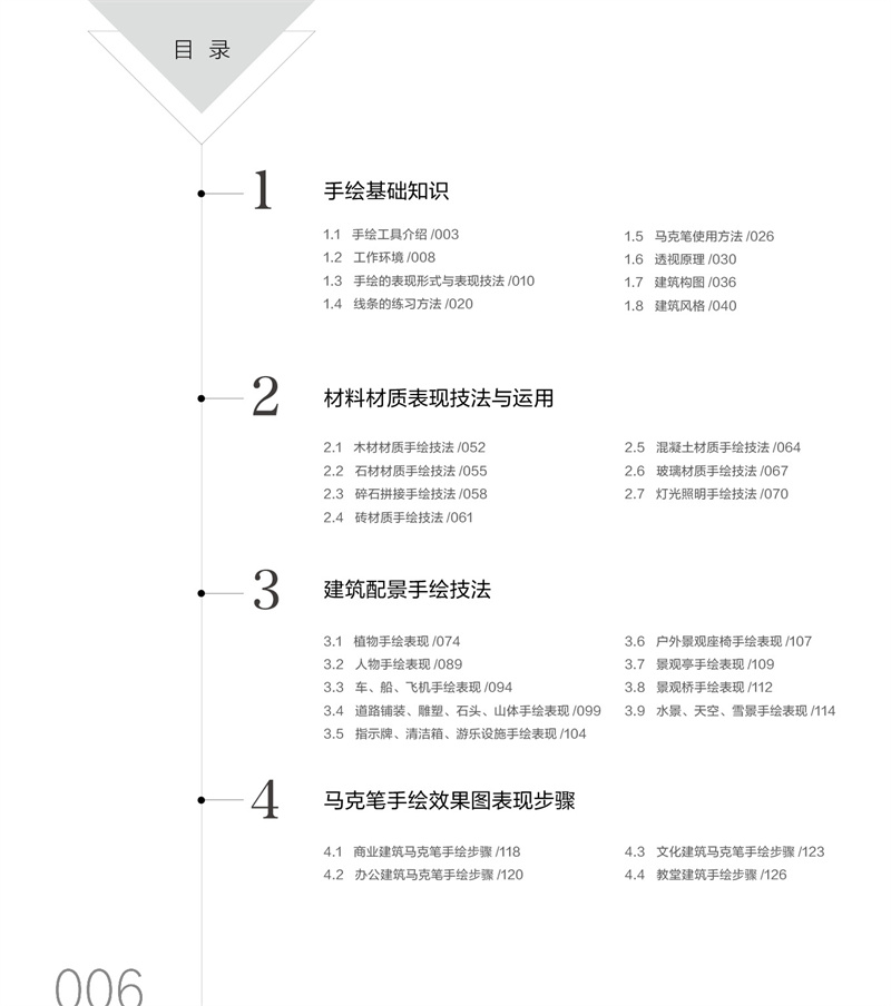 本书全面、系统地阐述了建筑手绘学习方法,由浅及深,从技法学习到实战应用,详尽地介绍了建筑场景手绘的配景植物、人物、设施、小品等,提供学习方法及实例参考,讲述设计手绘的表现形式、技法的掌握与应用,学习手绘工具、建筑风格、构图方式、马克笔使用技法。内容设计方面,在我社已出版的《建筑设计手绘效果图表现》的基础上,新增了材料材质的表现技法及运用章节,直击读者学习的痛点,系统地阐述材料技法的表达及场景的运用案例。