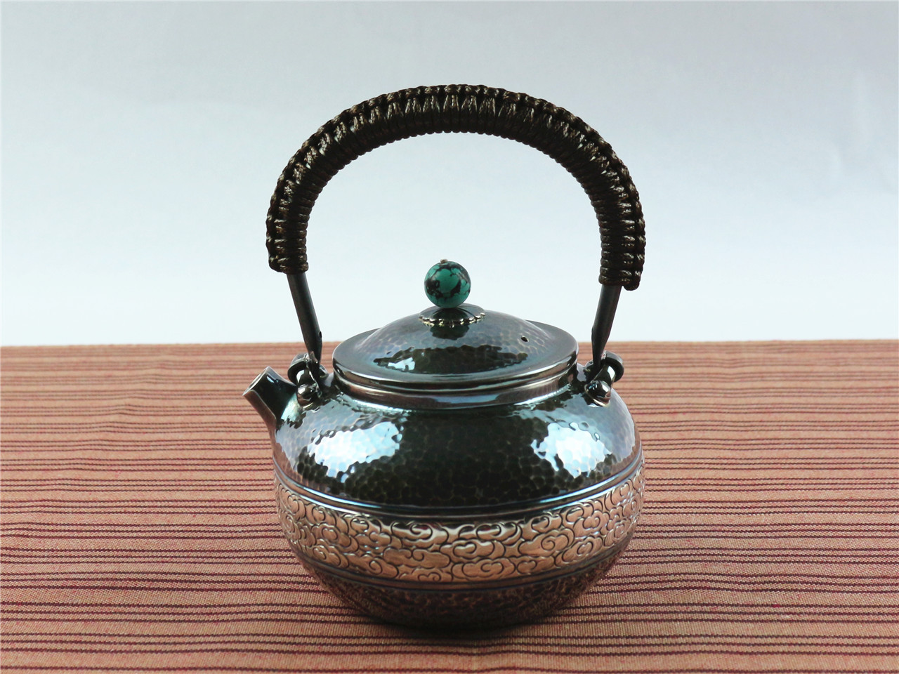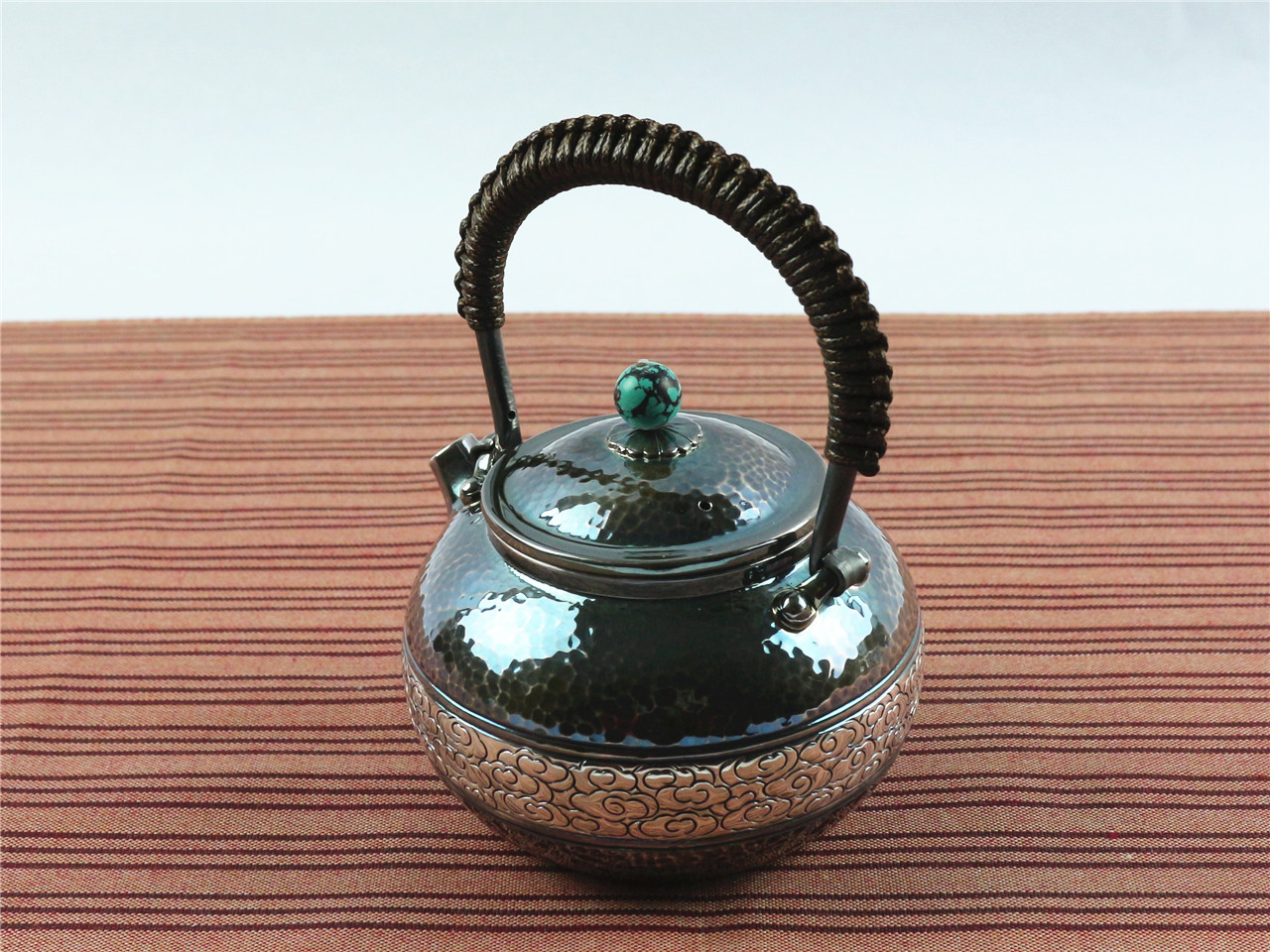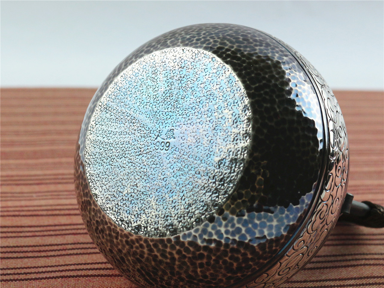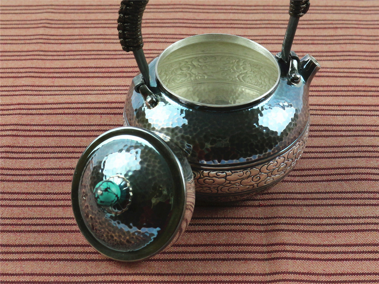 此壶短流,高提梁,绿松石盖钮,壶盖壶身密布槌目纹,壶身中部环饰一周带状祥云纹饰,祥云饰带作拋光处理与器身槌目纹氧化作旧形成鲜明视差,同质同器以工艺手法造成错银一般的美学幻觉,小壶因采用高提梁呈现出小中见大的气度,壶底铭款:足银999,丝绳缠提梁,美观实用,小壶中的上品。