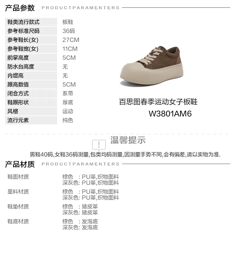 【云粉节】 BF楼百思图2026春季新款厚底松糕鞋板鞋休闲增高运动女鞋W3801AM6吊牌价759.现价439