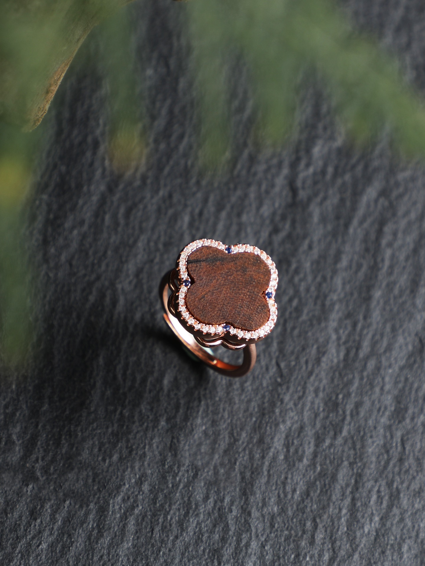 遇见~四叶草沉香戒指 四叶草时来运转戒指 925银镀金镶嵌沉香