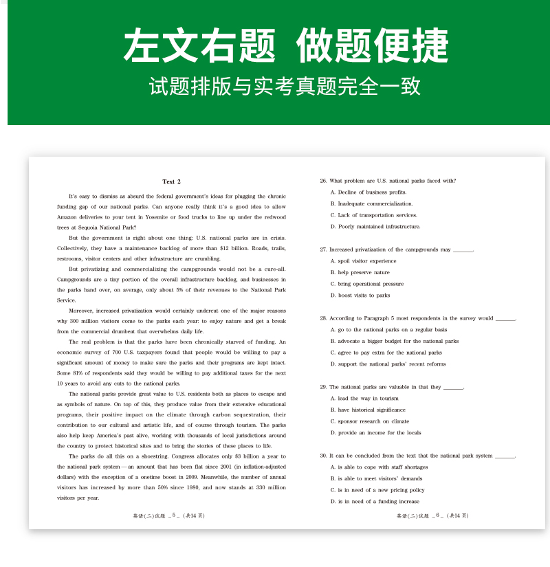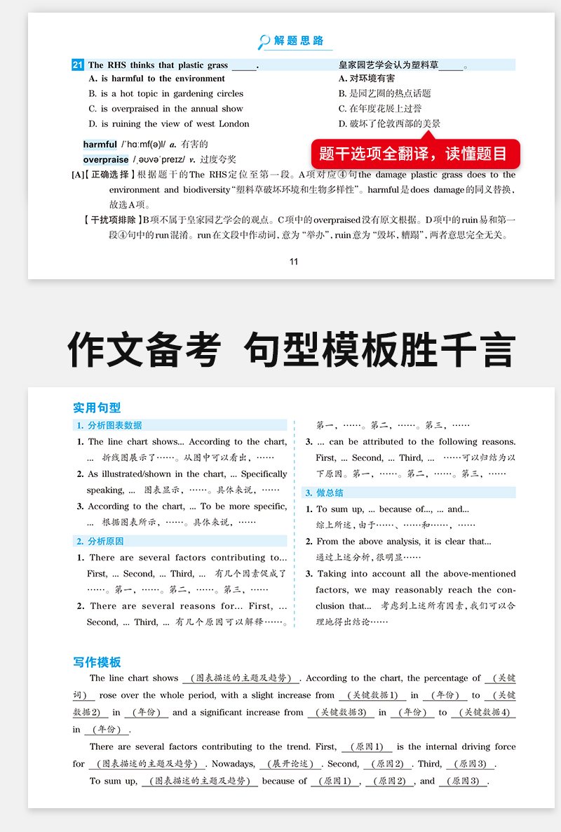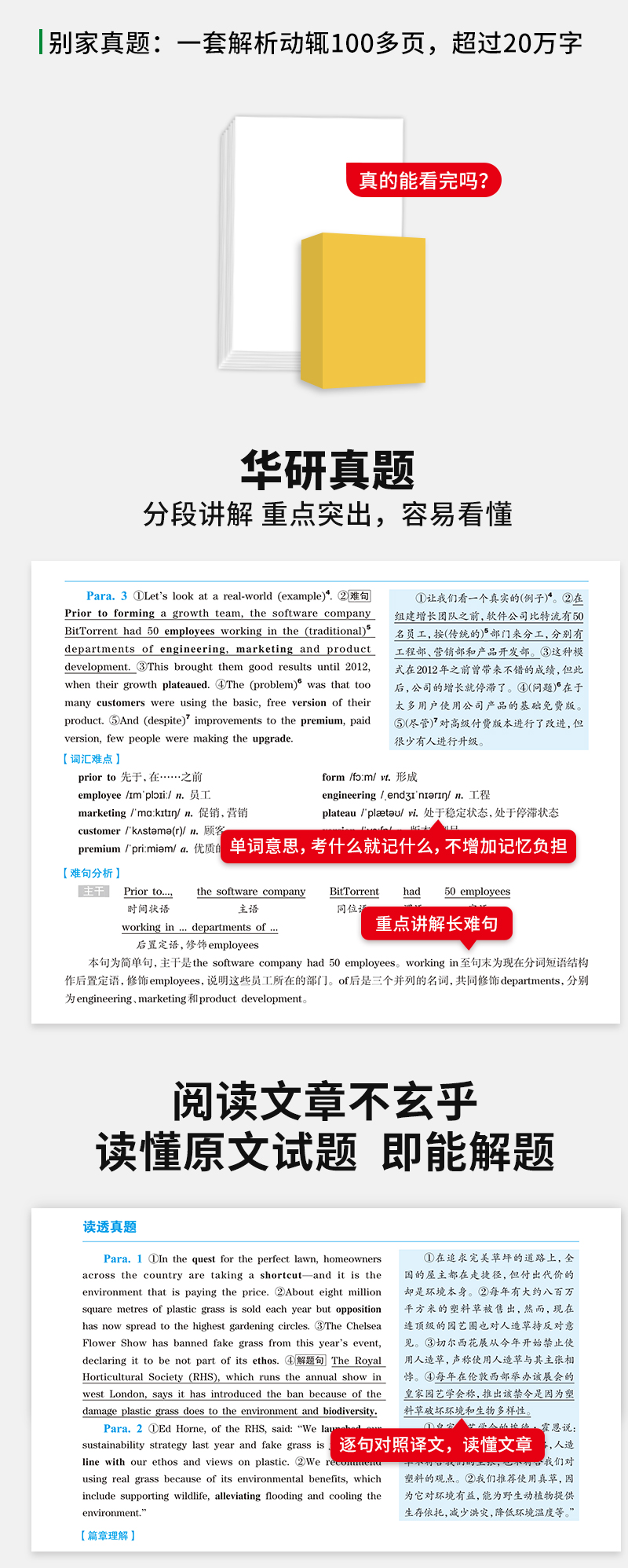 ①真题解析分册:文章导读+分段中英文对照讲解+注释语境词汇+题干选项翻译+难句分析,弄懂试题;