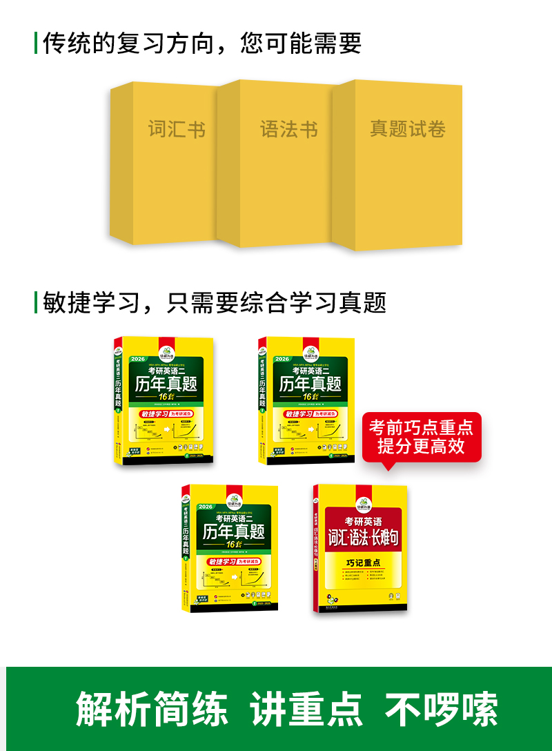 英语基础弱,第一次备考英语二的考生;四级500分以下或六级屡考不过的考生;做真题正确率低、阅读生词多的考生;使用传统备考方法效果差、备考时间短的学生;单独记单词、学语法效果差的学生;需要全面加强考研语法、长难句、词汇的考生。