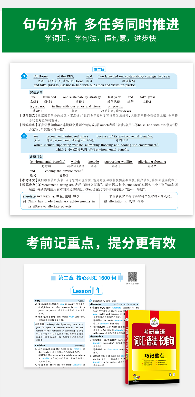 ②句句分析分册:重点词汇精讲,全面学习词汇的重点用法;真题逐句分析,逐句分析语法结构,破解理解难点,读懂真题每一个单词、每一个句子;