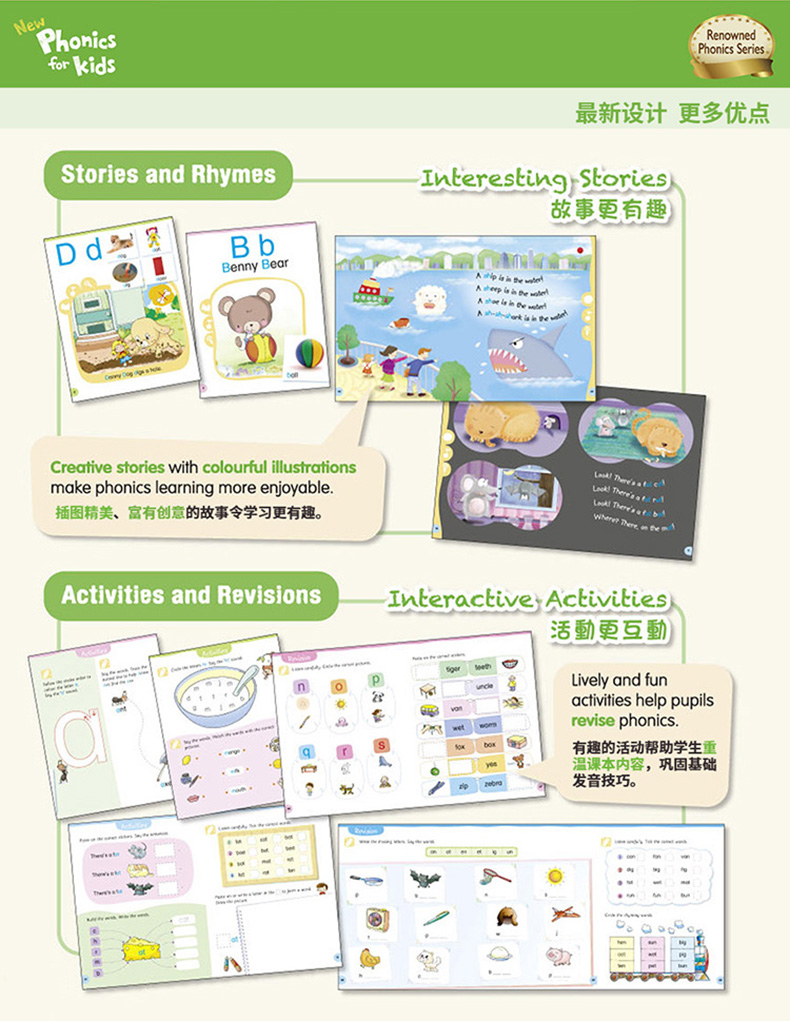 New Phonics for Kids是Phonics for Kids的修订版,全套书分为三级,共六册课本,是一套有系统的幼儿语音课程。每一课次教授一个语音项目,配合多种有趣的活动,帮助幼儿巩固所学。