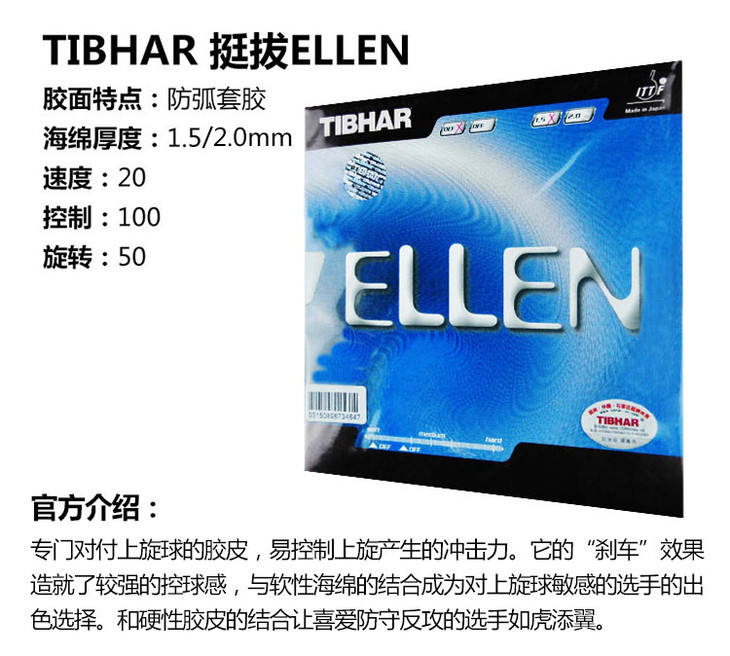 TIBHAR挺拔 ELLEN防弧 DEF防守/OFF攻击 乒乓套胶胶皮 国球汇