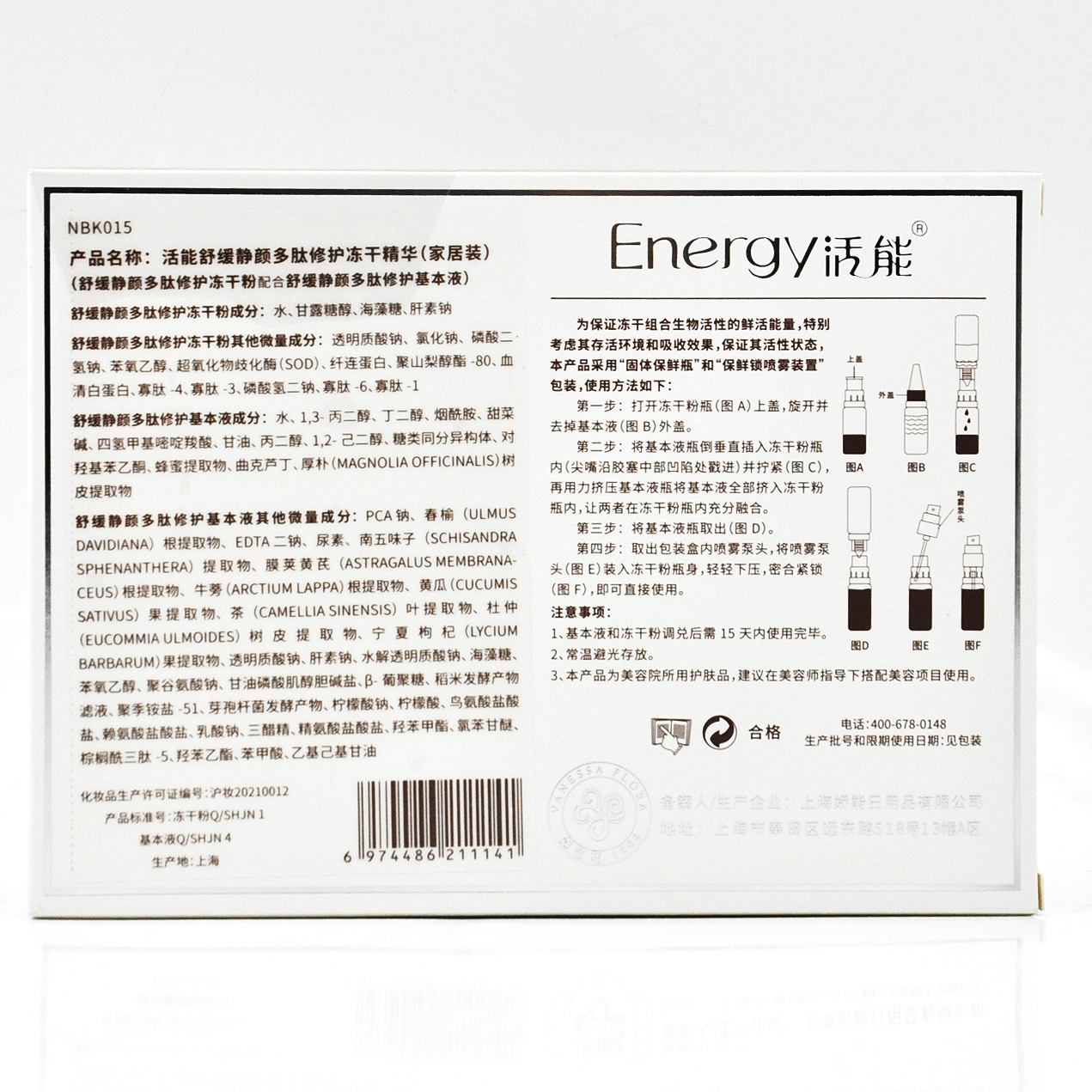 使用方法:基本液倒入冻干粉内,安装上喷头,调兑激活之后15天内使用完毕,存放冰箱保鲜箱。