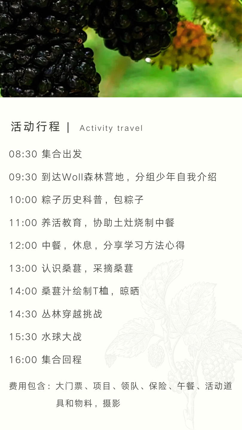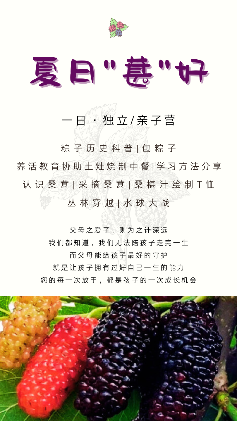 孩子志 | 夏日"葚"好 独立&陪同、自驾/大巴 张家港营地【会员价】 5/25(周六)、5/26(周日) 一起桑椹汁绘制T恤,包粽子,分享学习方法,丛林穿越,水球大战….