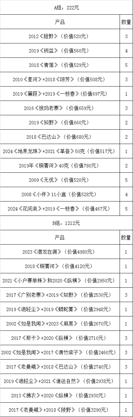 根据售价分为A组和B组两个档位, A组有40个,每个售价222元,茶品总价值均大于444元;B组共有20个,每个售价1212元,茶品总价值均大于2424元。