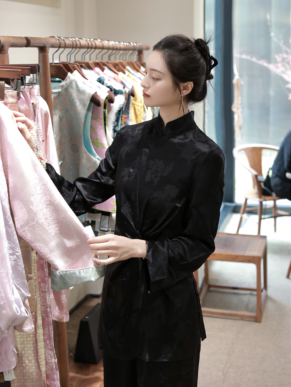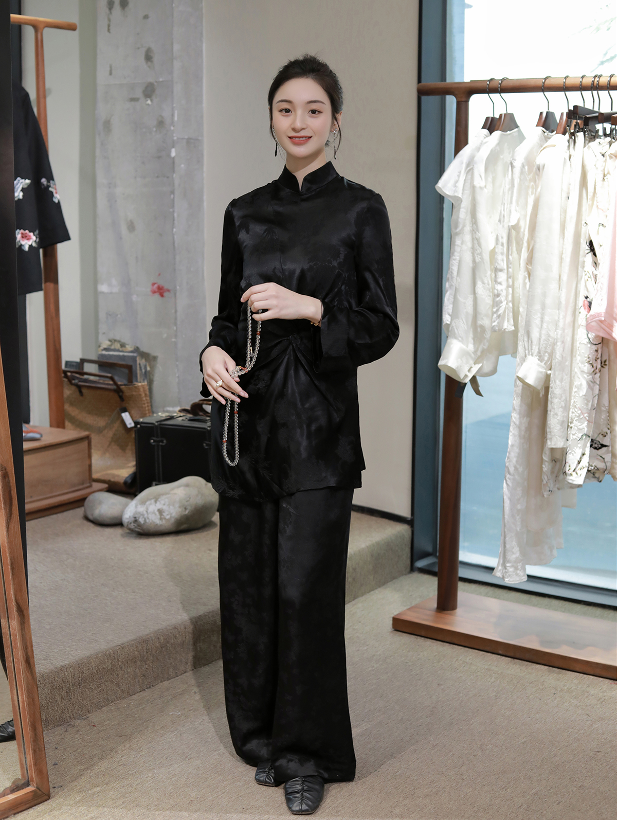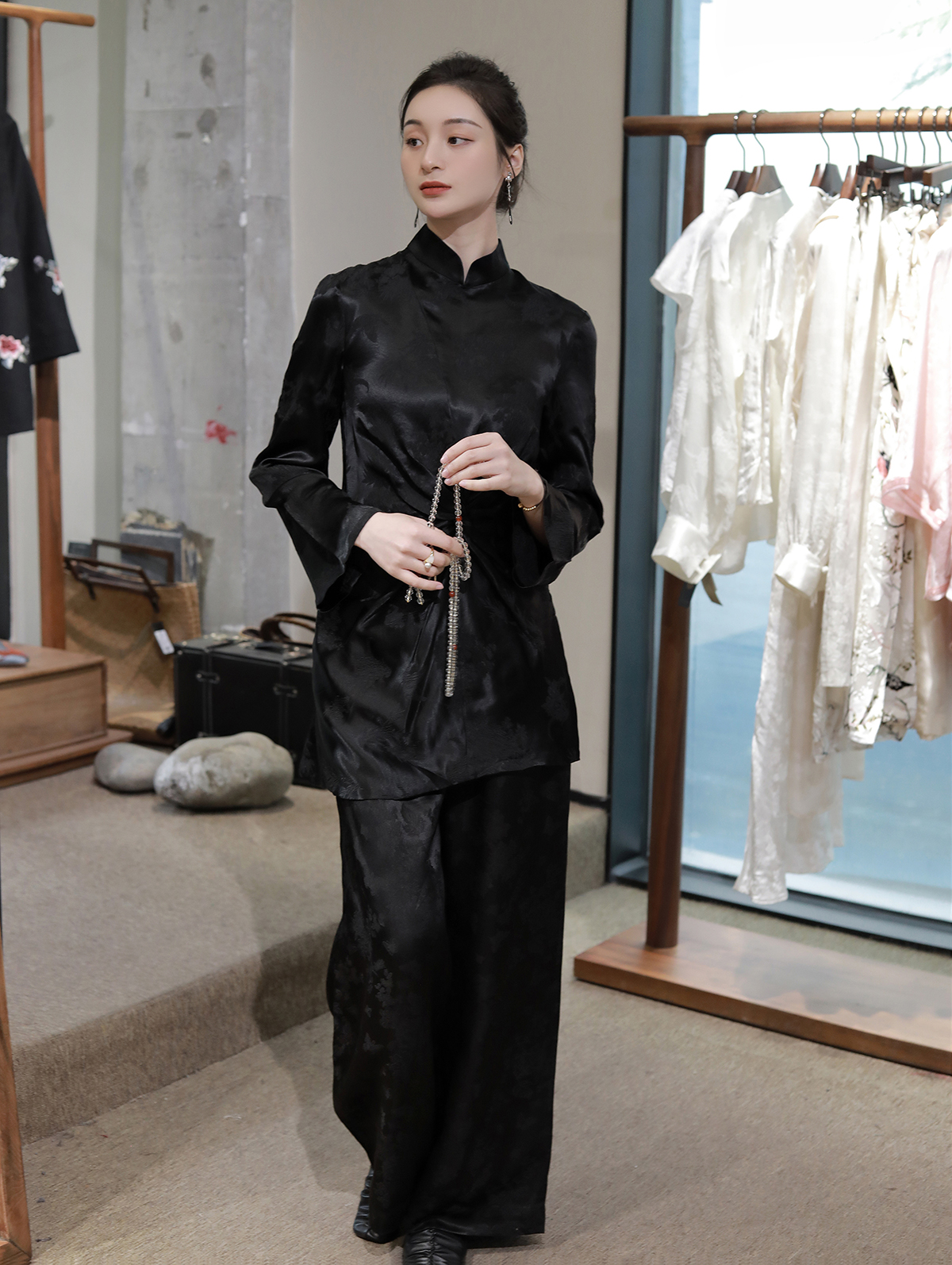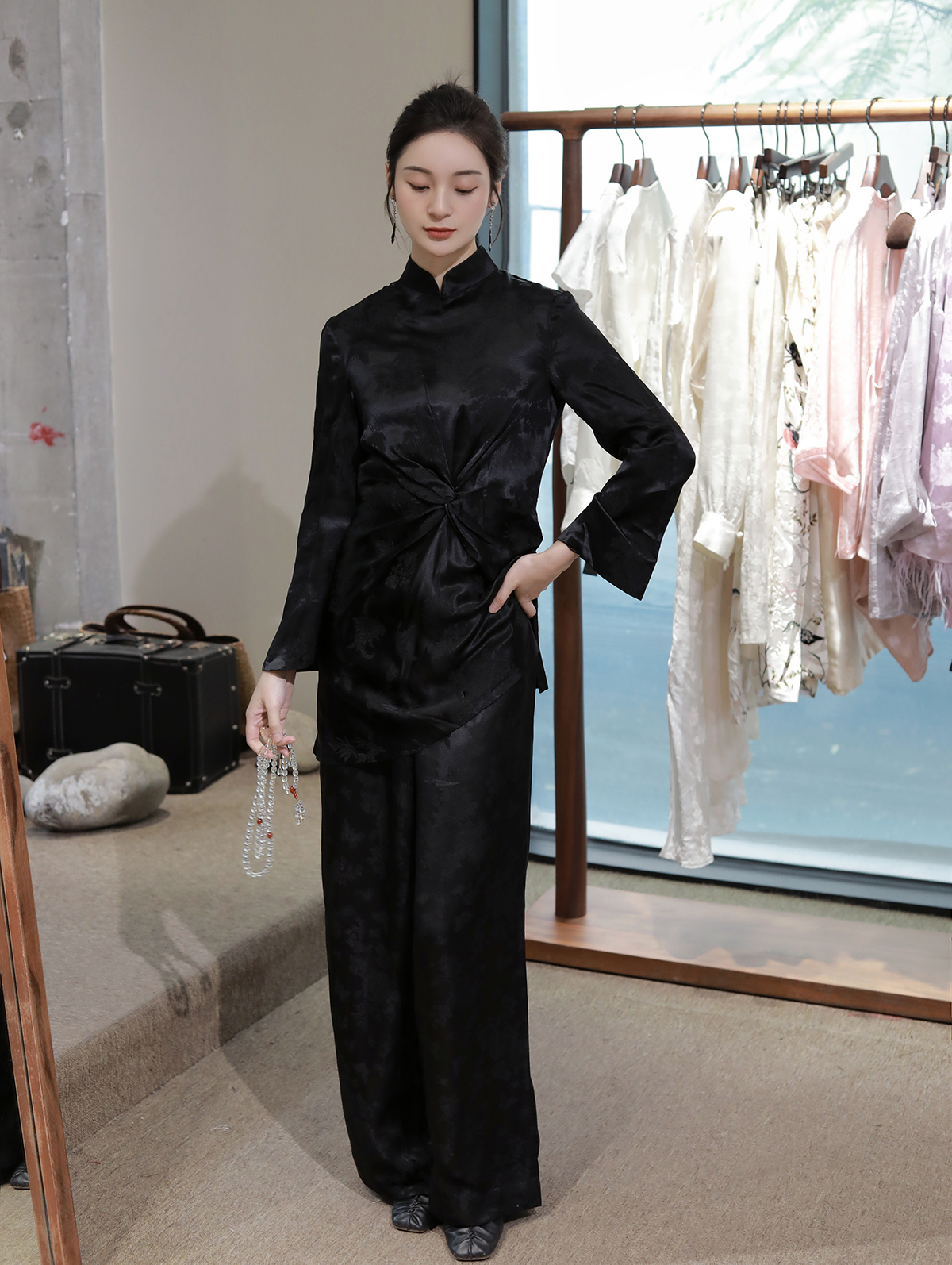 盛唐牡丹 |真丝冠乐绉褶皱款上衣-黑色