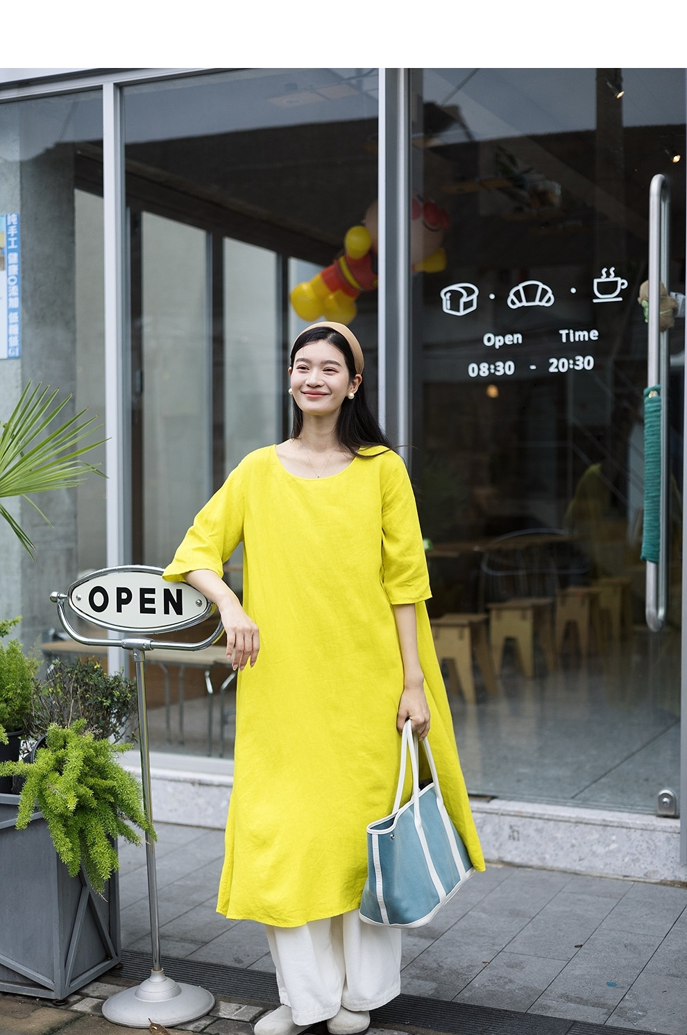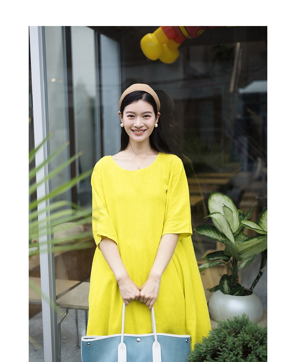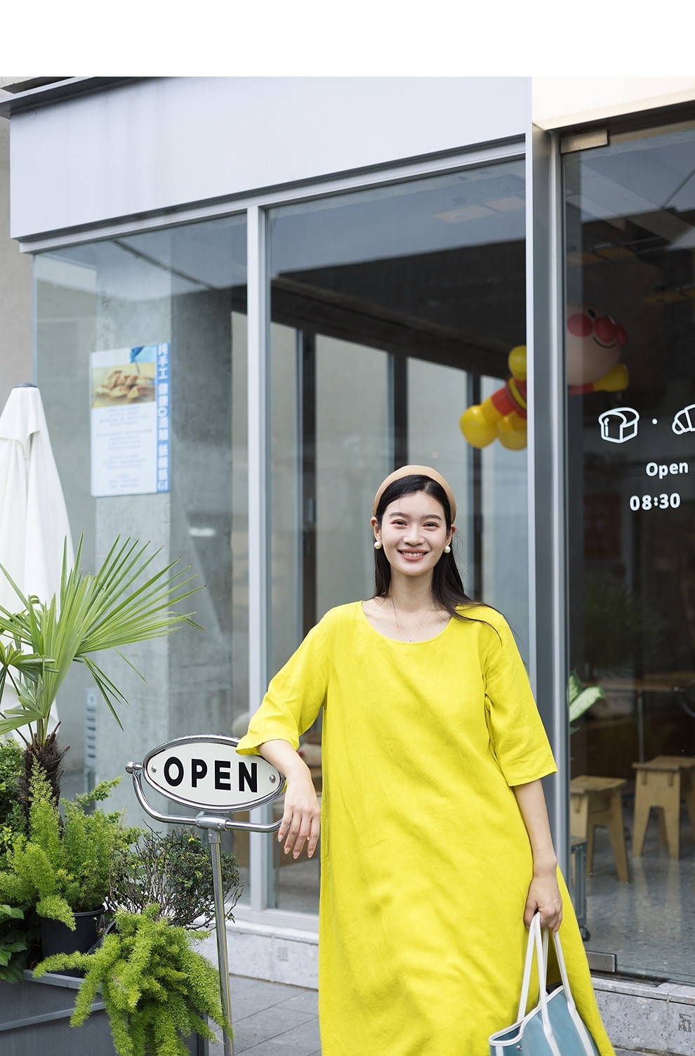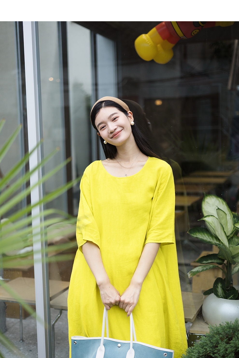 绽放女装552朵/高端加密水果酵素洗亚麻中袖多巴胺连衣裙女度假裙
