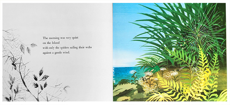 在充满诗情画意的《小岛》中,平和亲切的叙述文字和精美的绘画相映生辉,使小岛一下子在我们眼前活了起来。开阔的远景和逼真的近景相互交织,与惟妙惟肖的动植物一起打造出富有层次的海岛世界,让读者仿佛置身于小岛之上,徜徉于海天之间……