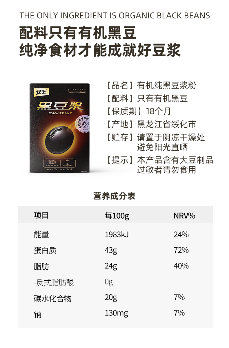 龙王有机黄豆/黑豆纯豆浆粉 175g(25*7杯)*1