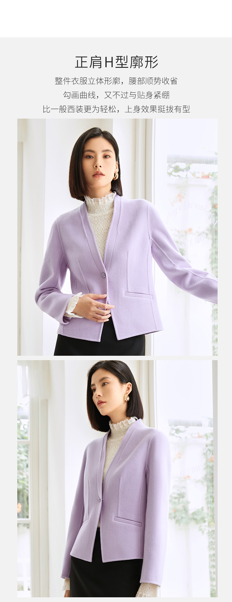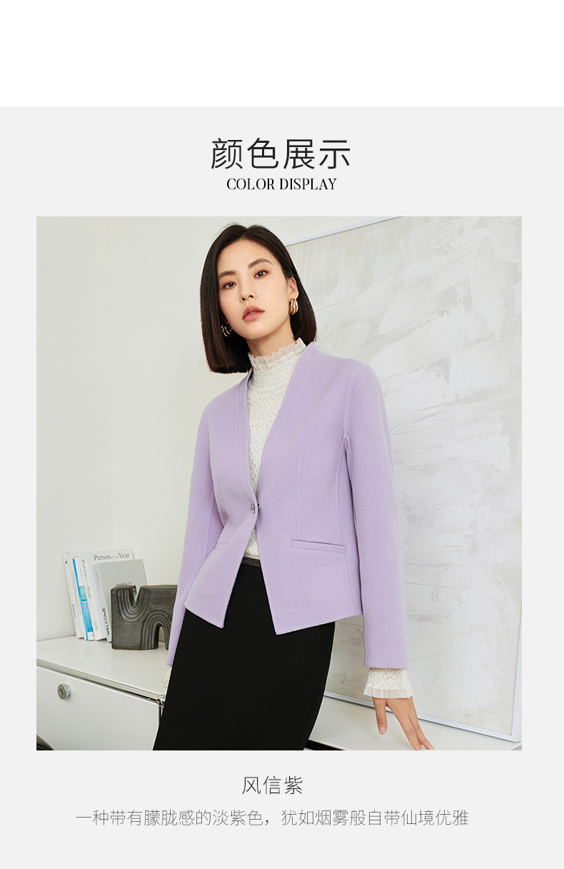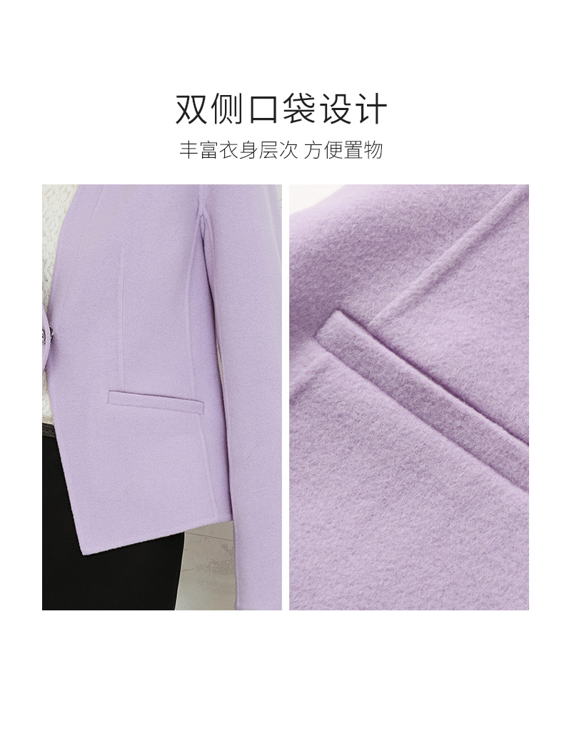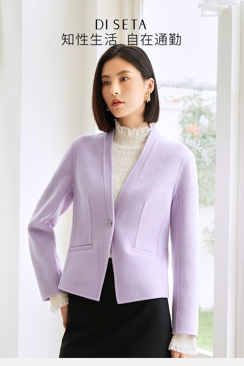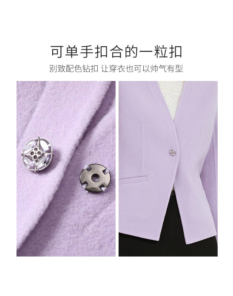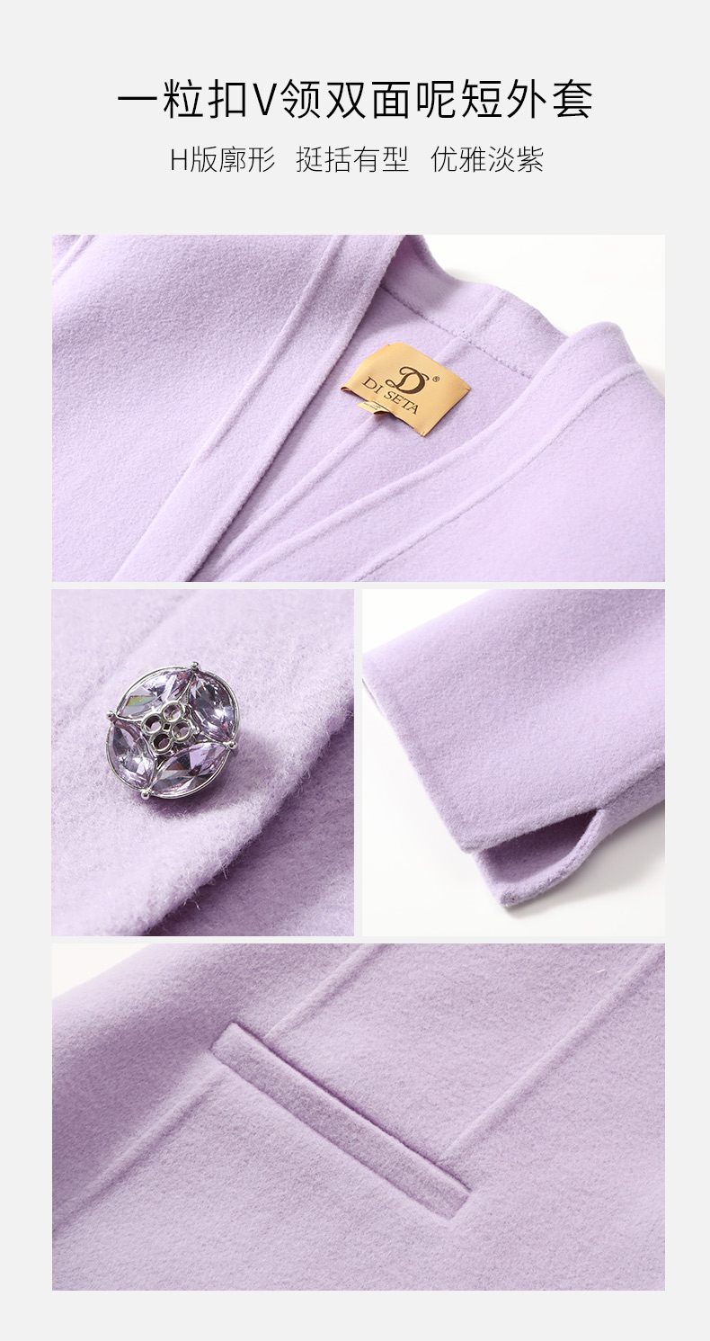 玳莎2023冬新款羊毛双面呢大衣一粒扣优雅紫色气质V领短款外套女 DD37308