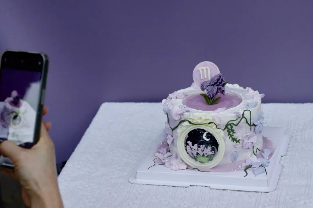 本次的天蝎座蛋糕,用巧克力制作的鸢尾花,恬静绽放,卓然立于浪漫紫水池,有如照见姑苏仙子。手工绘制的紫蓝奶油鸢尾花英文名Iris,源于希腊女生伊利斯,在希腊语中是彩虹的意思,我们制作的紫色鸢尾寓意爱意和吉祥。奔走在午夜星辰的天蝎,追风逐月不停留,既往不恋,纵情向前。只是午夜梦回,还有温柔的留恋。毕竟所有水象人,终身都要和情绪相伴。这是天蝎偶露真容,心灵狭缝中的光束,温柔又耀眼,恰似一轮新月,抚慰人心。每次篆刻天蝎的星座主题蛋糕时,与我们的传统节气「霜降」「立冬」撞个满怀。要有更多的中国元素,满足我们的中国胃。 香芋入甜品,我们做了十年。我们是不用罐头这些预制食材的,追求极端口味也是天蝎的偏执了。好味道在于食材,现做,以及独家的配比配方,比较费手费时间,光烤大芋头,大概就是两个小时。这个过程很美妙,荔浦芋头自带紫色槟郎纹路,烤的时候带着独特香气。紫薯奶油入口丝滑细腻,夹层的芋泥芝士夹心奶香浓郁,融合了食材最原始的味道,融合在层层柔软蛋糕中的芋头芝士块,味甜,不腻,好吃到有点上头!四层戚风和三层夹心,最妙的是最中间和顶部,椰子入味,自制的椰子冻和凉粉镜面,挑起更富的味蕾神经,一口下去,椰香的丝丝尾韵收尾,感谢大自然给予的美味。