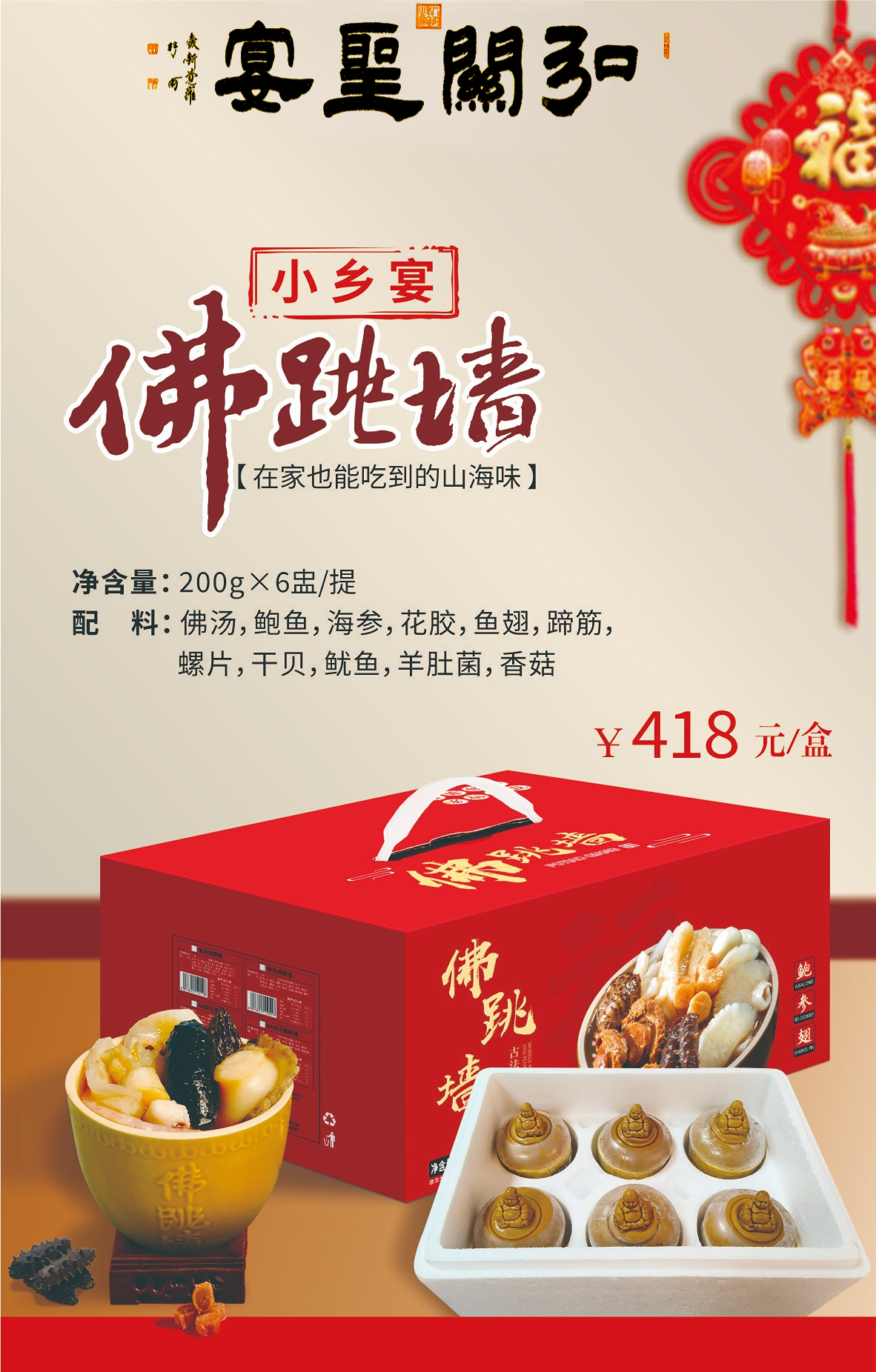 弘关圣宴佛汤佛跳墙200g*6罐海参鲍鱼佛跳墙加热即时炖盅礼盒装