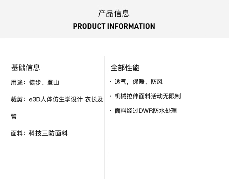 -面料经过DWR防水处理,可以短雨,也有防雪和抗污的效果,透气性比WindStopper好些,不过防风略弱一些;