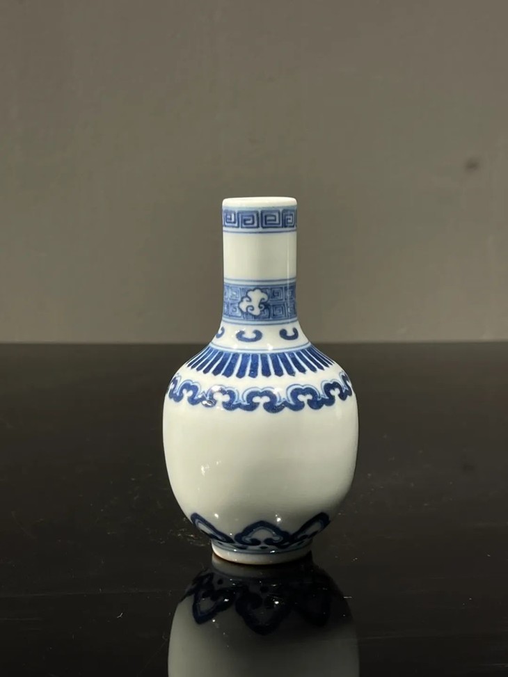 此对青花如意纹袖珍长颈瓶,如图所示,除口沿略有磨损痕,以及细微釉面磨伤与刮痕外,全器保存状况完美无瑕。